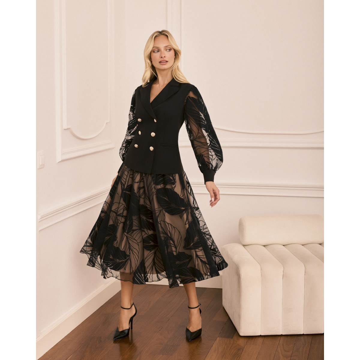 Elegantní sada s elegantním charakterem. Vrchní díl tvoří dvouřadové sako s nápadnými průhlednými rukávy zdobenými motivem listů. Spodní díl tvoří rozšířená midi sukně z poloprůhledné látky se stejným listovým vzorem.
