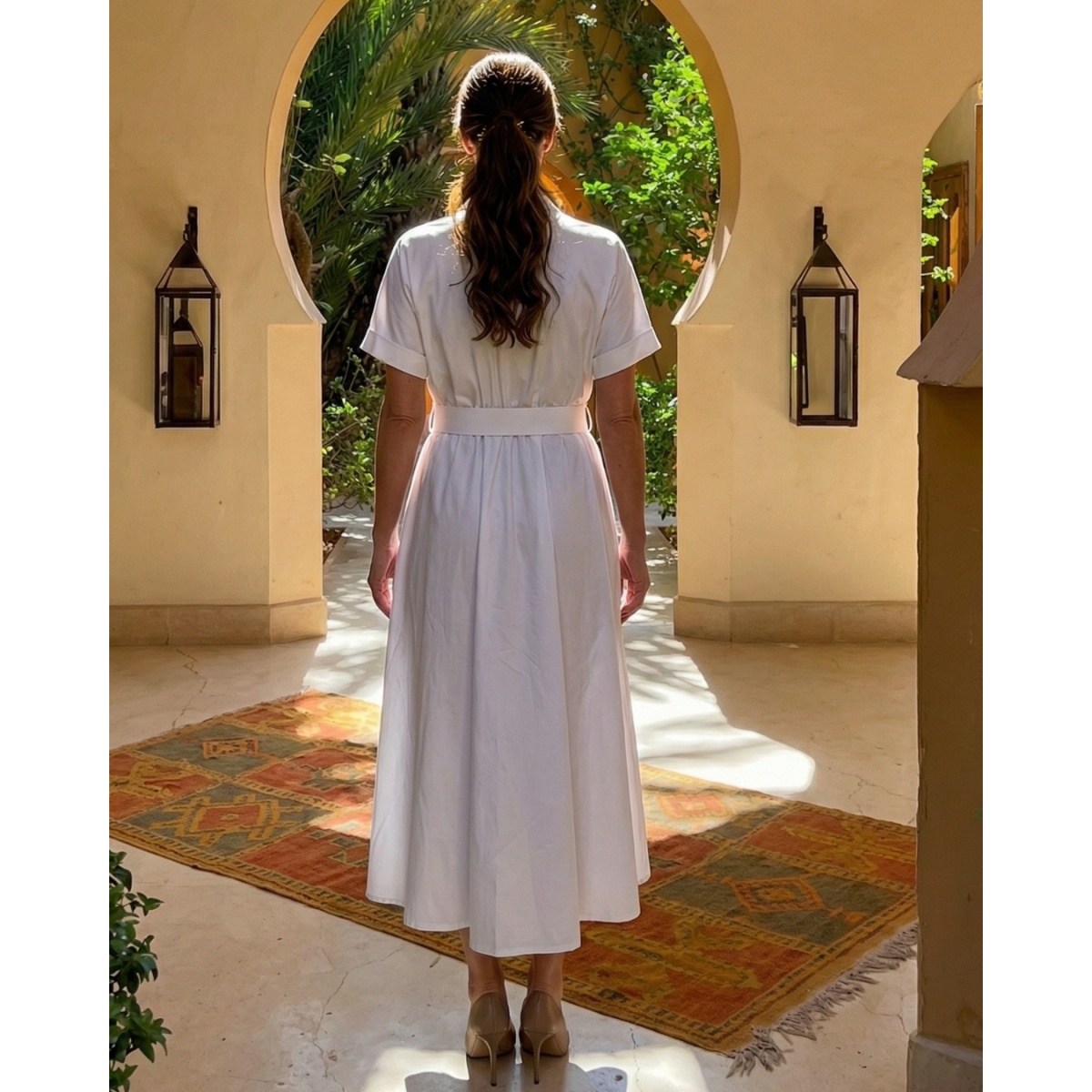 Elegantní bílé midi košilové šaty jsou nadčasovou volbou pro ženy, které oceňují klasiku v moderním pojetí. Jednoduchý, ale zároveň velmi ženský střih zajišťuje, že model se skvěle hodí jak pro rodinné oslavy, tak pro denní stylizace.