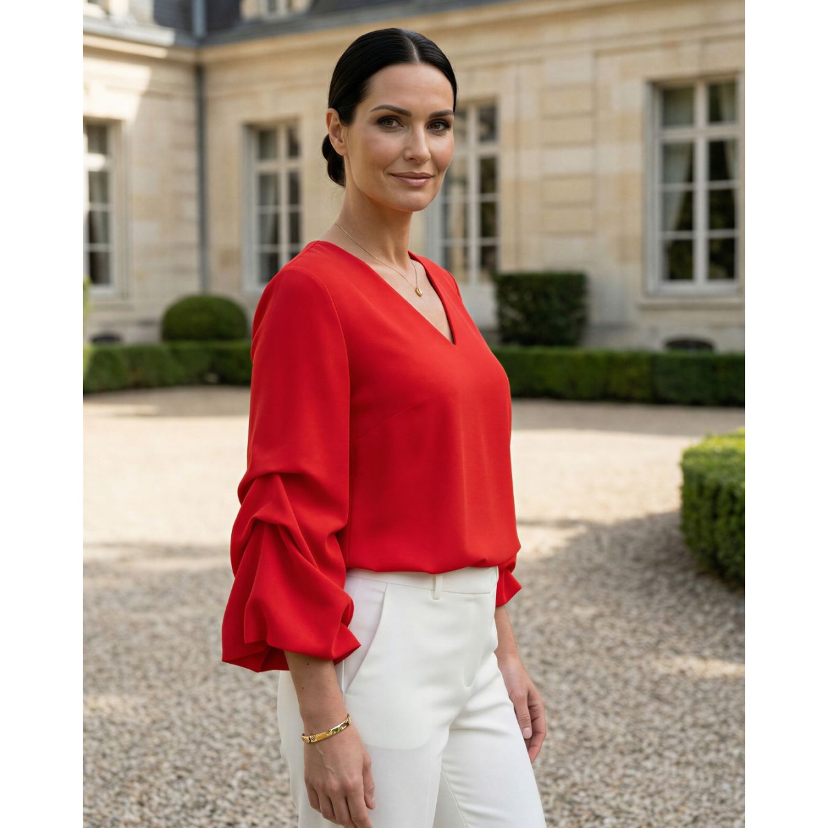 Elegantní dámská halenka nadčasového střihu, určená pro zvláštní příležitosti. Jemný výstřih do V krásně prodlužuje krk a zeštíhluje siluetu, přičemž zachovává noblesu a střídmost.