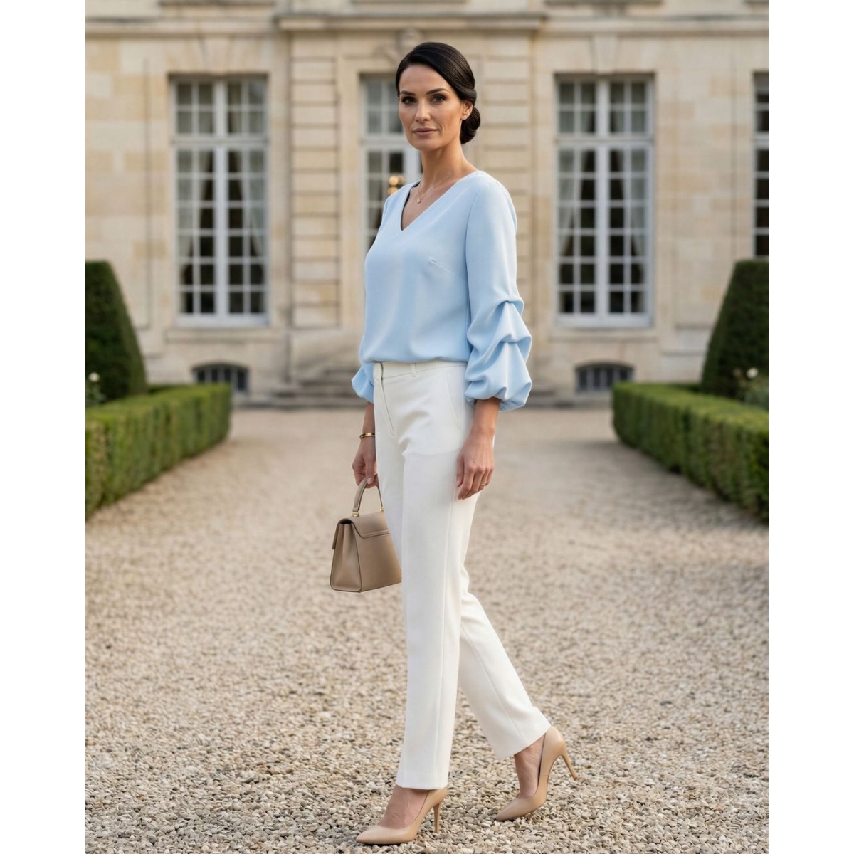 Výstřih ve tvaru písmene V opticky prodlužuje krk a zeštíhluje siluetu při zachování plné elegance. Halenka má poutavé 3/4 rukávy s jemným řasením a gumou na manžetě, které dodávají lehkost a ženský nádech a zároveň zakrývají oblast ramen.
