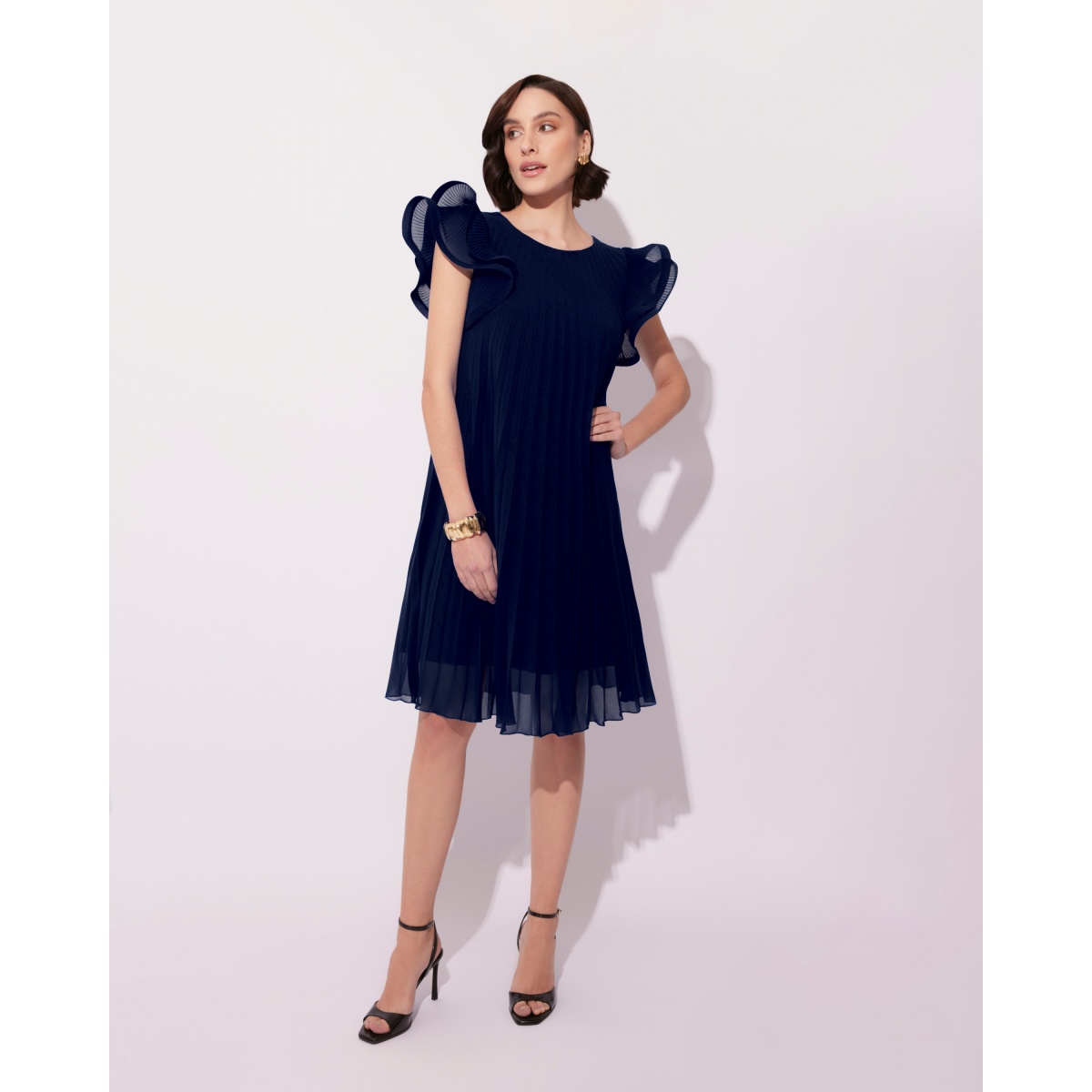 Jedinečné šaty v tmavě modrém odstínu, které zaujmou svou lehkostí a vzdušností. Jsou vyrobeny z jemného šifonu a mají volný střih pro pohodlný a elegantní vzhled. Plisovaná tkanina dodává šatům jemnou eleganci a díky délce ke kolenům jsou ideální volbou pro různé příležitosti.