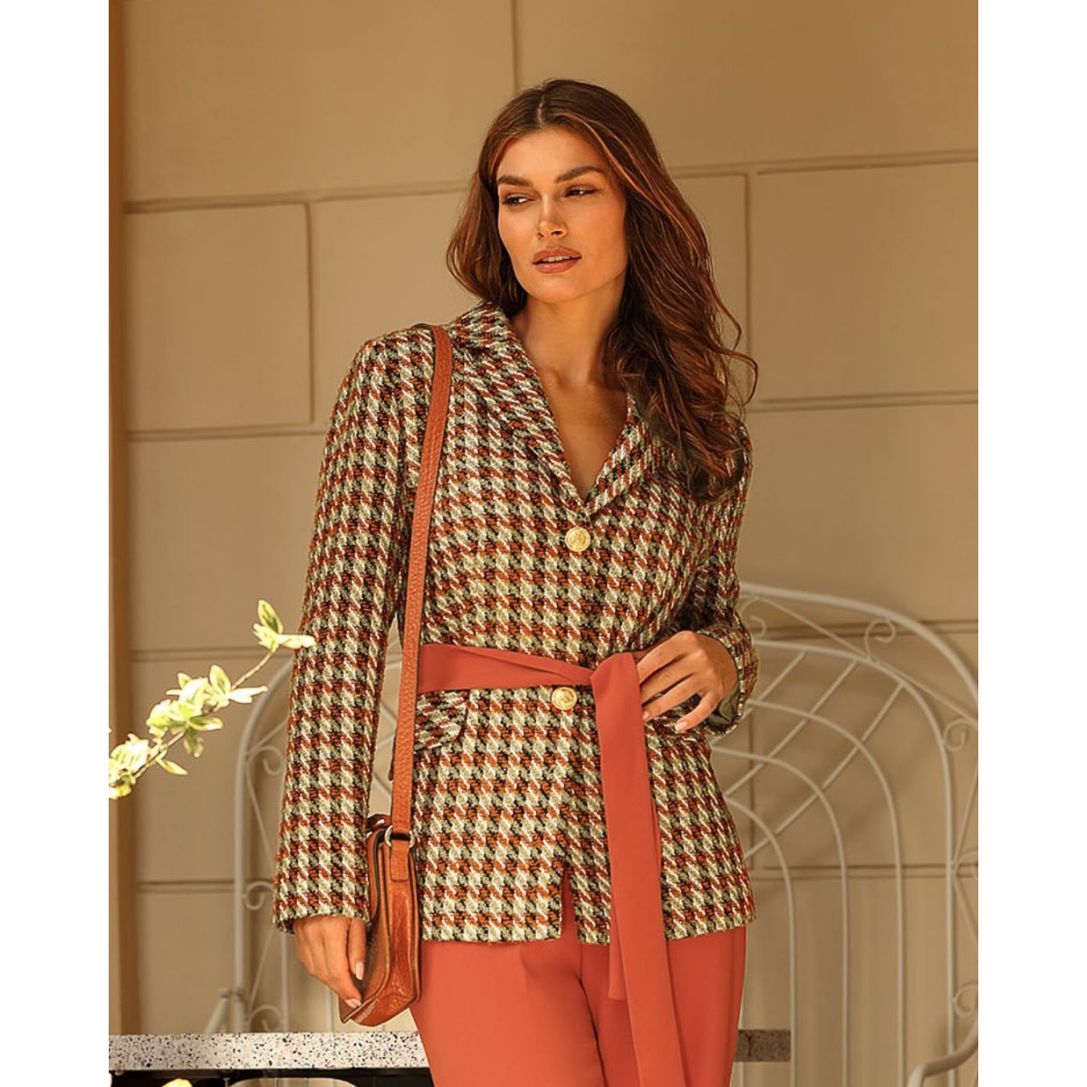 Dámský oblek Renne v oranžových odstínech je elegantní souprava s kalhotami kombinující klasiku s nejnovějšími módními trendy. Bude se hodit jak do práce, tak na společenské a rodinné příležitosti. Bezvadný střih, atraktivní zpracování a módní barvy jsou nespornými přednostmi tohoto kompletu. Elegantní moderní sako je ušito z příjemné a krásné látky šanelového typu. Pozornost upoutá jeho atraktivní kostkovaný vzor s oranžovými akcenty. Perfektní střih saka dokonale zvýrazní přednosti ženské siluety a zakryje případné nedostatky. To je umožněno délkou saka po boky a jeho mírně projmutým střihem. Skvěle vypadá také výstřih do V s klasickým límcem. Díky němu lze sako nosit přes košili, halenku nebo rolák, ale také přímo na těle. To vám dává spoustu možností stylizace, ale také umožňuje získat správný tepelný komfort v závislosti na počasí. Bunda se zapíná na dva ozdobné zlaté knoflíky uspořádané v řadě. Pas je dále zvýrazněn šerpou v odstínu kalhot, kterou si můžete elegantně uvázat podle libosti. Boky saka zdobí dvě obdélníkové nášivky. Rukávy jsou dlouhé a rovné. Sako je opatřeno viskózovou podšívkou, která vyniká pohodlím a odolností. Široké rovné kalhoty jsou v krásné oranžové barvě, která dokonale ladí s barvami saka. Pozornost upoutá jejich bezvadný střih, díky němuž perfektně padnou. Na boku se zapínají na zip. Střih obleku je vhodný pro mnoho typů postav.