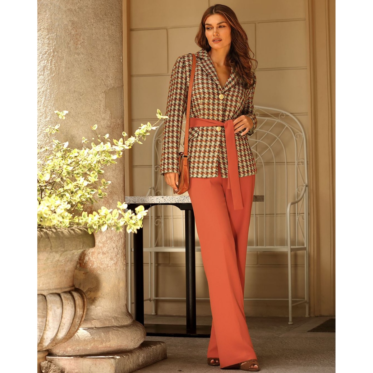 Dámský oblek sestávající z moderního saka a kalhot. Sako je vyrobeno z látky Chanel v módním kostkovaném vzoru. Kalhoty v oranžové barvě mají jednoduchý, nadčasový střih.