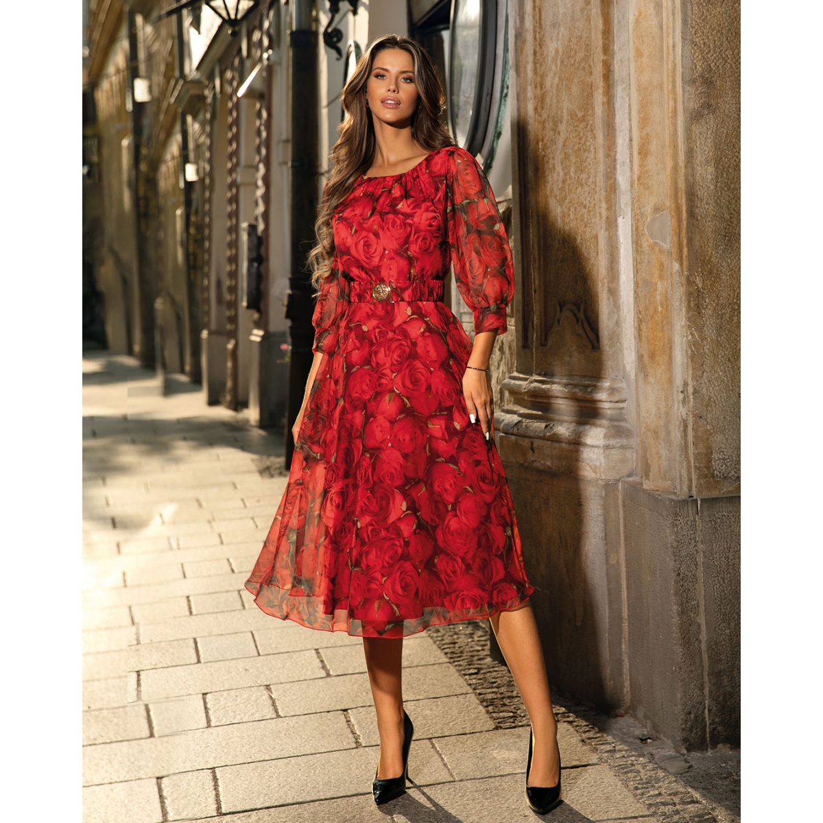 Tyto jedinečné šaty byly vytvořeny pro ženy, které milují kombinaci klasického a osobitého stylu. Jsou vyrobeny z lehkého šifonu v efektním vzoru červených růží, upoutají pozornost a vyzařují ženskost.
