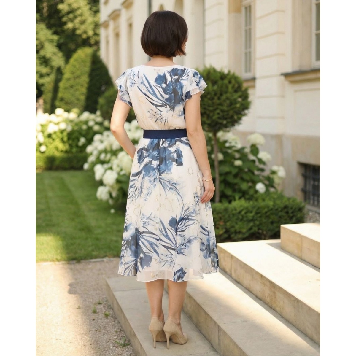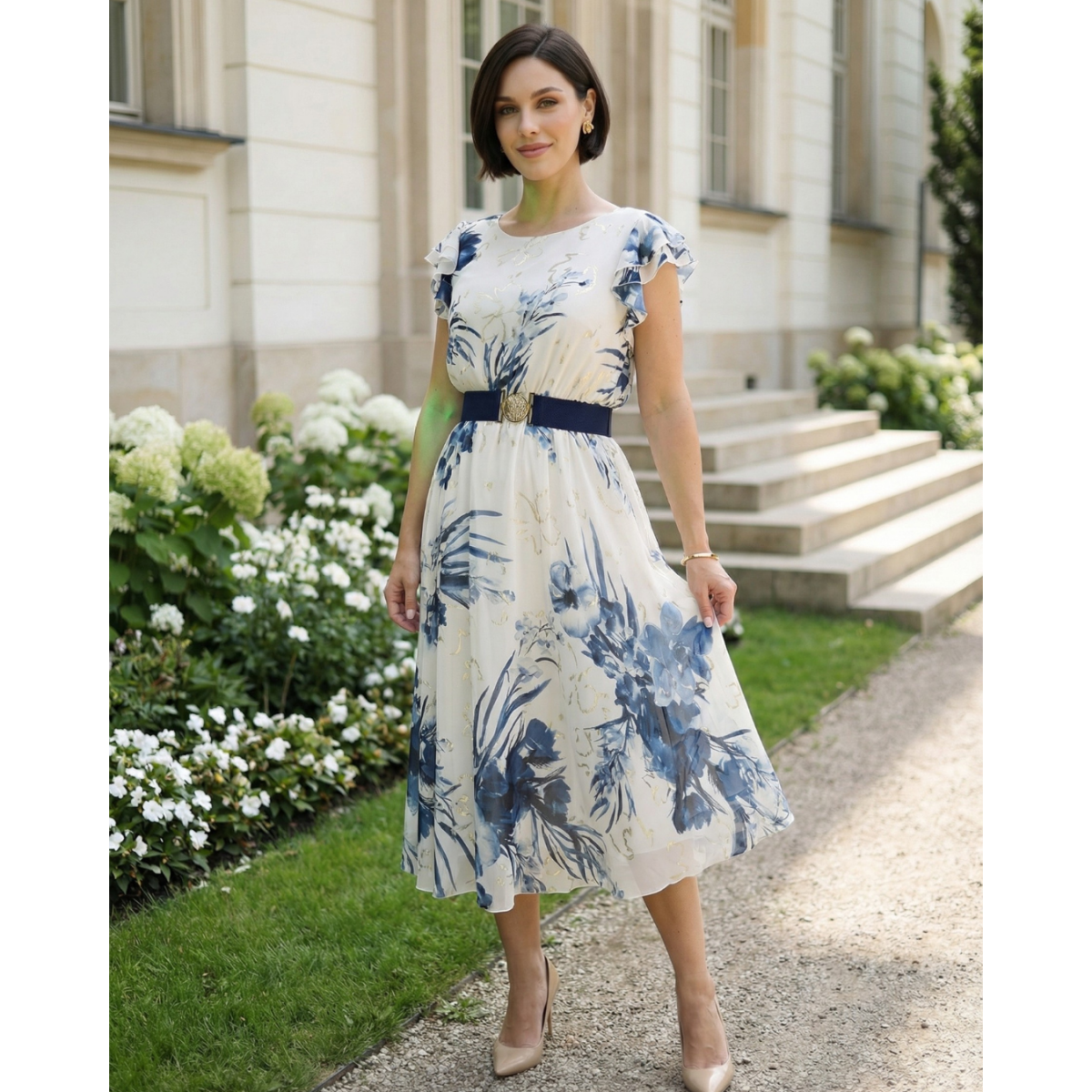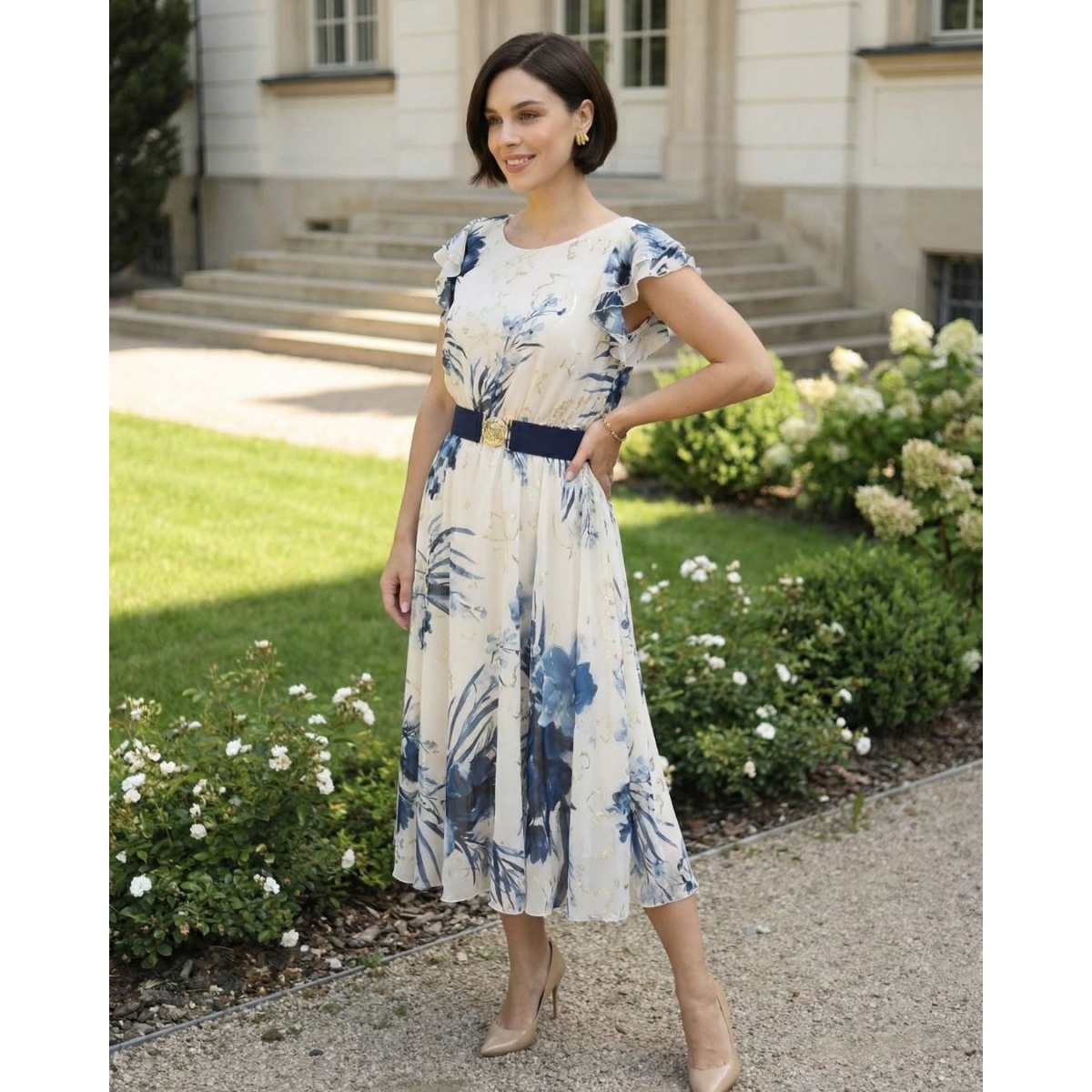 Klíčové vlastnosti: ✔ Střih: rozšířený, ženský ✔ Rukáv: krátký, dvojitý volánek ✔ Výstřih: kulatý ✔ Délka: midi ✔ Barva: bílá v modrých květech s jemným stříbrným leskem ✔ Podšívka: materiál: 100% viskóza ✔ Pas: přestřižený, na gumu, ozdobný pásek se zlatou sponou ✔ Zapínání: knoflíky, model přes hlavu