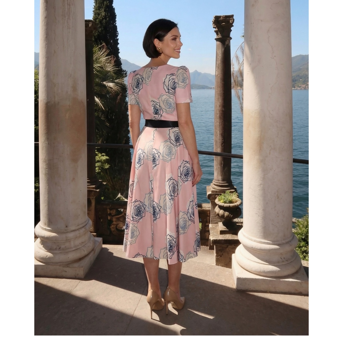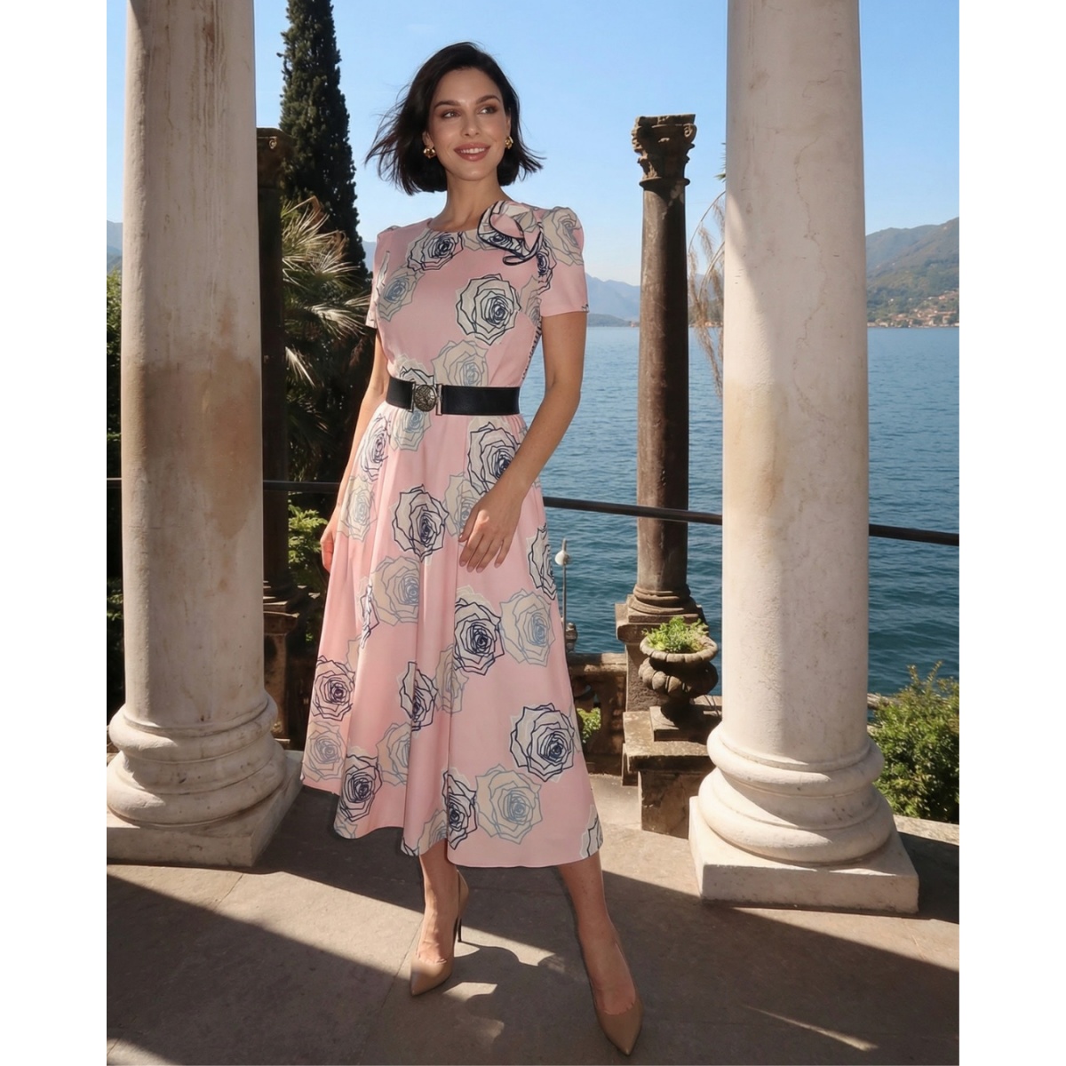 Květinové midi šaty s pasem zvýrazněným páskem s ozdobnou sponou. Ženský model, který se vyznačuje elegancí a šikem. Vyrobeno z příjemného, jemného taftu v pudrově růžové barvě.