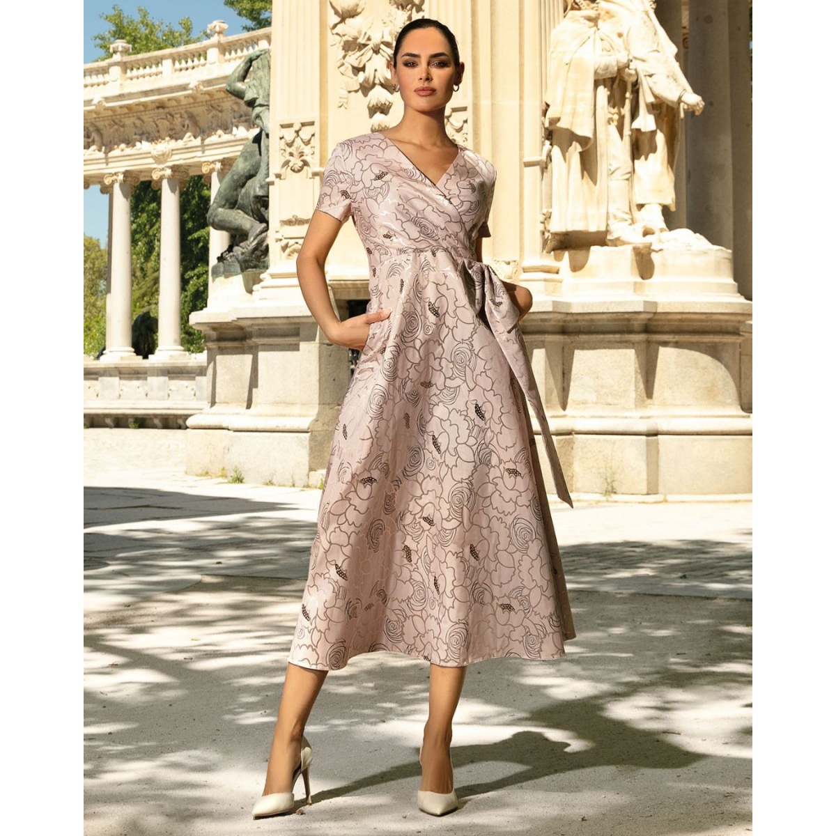 Diese Kreation ist ein phänomenales Abendkleid in einem wunderschönen Rosaton. Das schimmernde Metallic-Muster im trendigen 2024-Blumenmuster verleiht einen Hauch von Glamour. Florale Motive sind zeitlos und die Kreation wird auch in den folgenden Saisons nicht an Aktualität verlieren. Dieses Modell ist die perfekte Wahl für besondere Anlässe. Der perfekte Schnitt zieht die Blicke auf sich. Der leicht ausgestellte Schnitt mit betonter Taille und einem Umschlagausschnitt ist ein Vorschlag, der für verschiedene Körpertypen geeignet ist. Ein zusätzliches dekoratives Element ist die asymmetrisch platzierte Krawatte um die Taille. Der weiche, angenehme Taftstoff fließt schön. Der trendige rosa Farbton eignet sich für viele Anlässe. Der tiefe Ausschnitt betont die Figur, verschlankt optisch den Hals und ist sehr sinnlich. Die Krawatte kann nach Ihrem Geschmack geformt werden. Das Kleid hat kurze und gerade Ärmel. Auf der Rückseite befindet sich ein verdeckter Reißverschluss. Die Kreation hat außerdem versteckte Taschen. Das Modell ist mit einem Viskosefutter versehen, so dass das Kleid angenehm zu tragen ist und perfekt sitzt. Die Maxilänge ist sehr schick und eignet sich auch für die formellsten Anlässe.