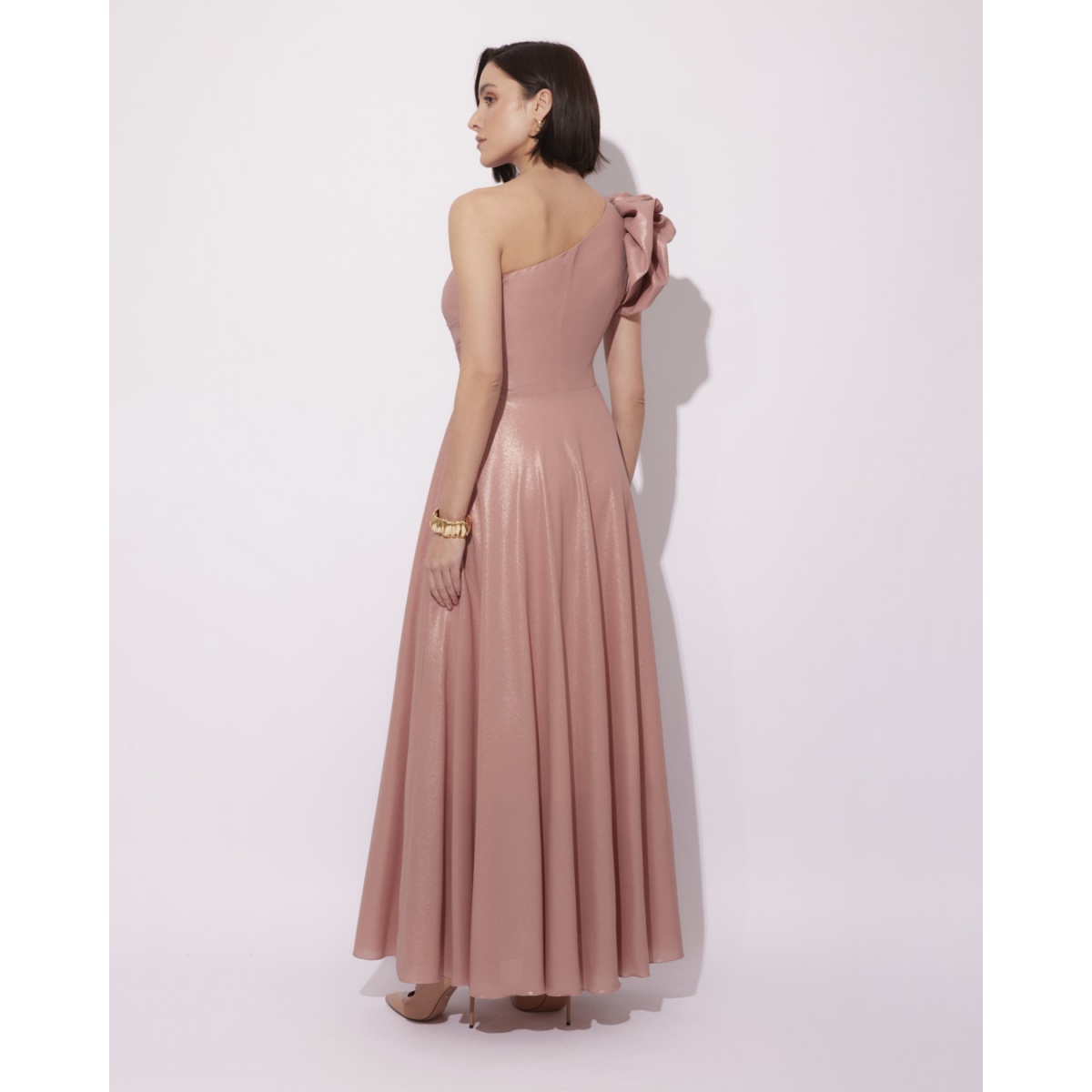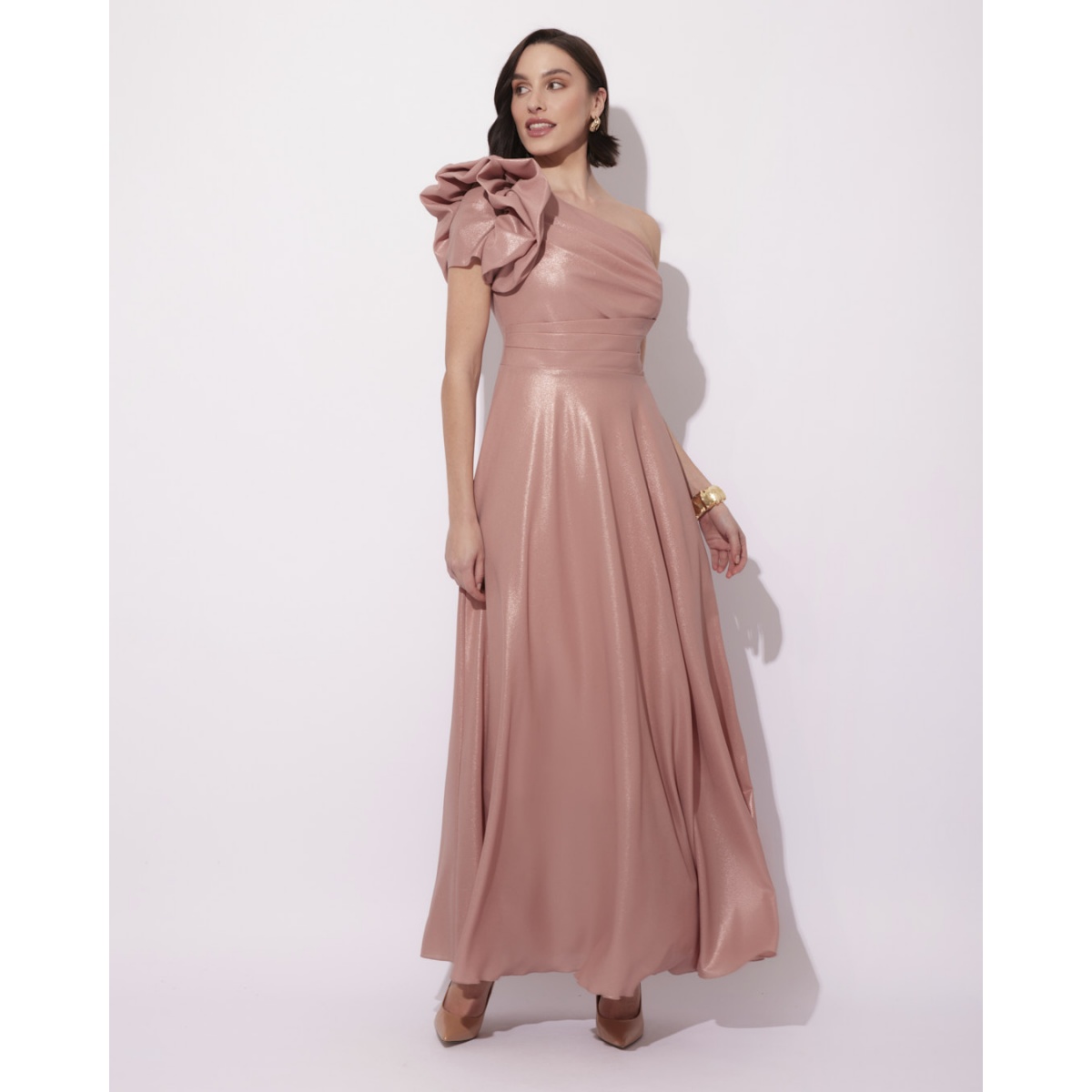 Abendliches Maxikleid mit einem asymmetrischen One-Shoulder-Oberteil. Ein ausgestellter Saum, der schön fließt, und dekorative Drapierungen an der Schulter unterstreichen den einzigartigen Charakter der Kreation.