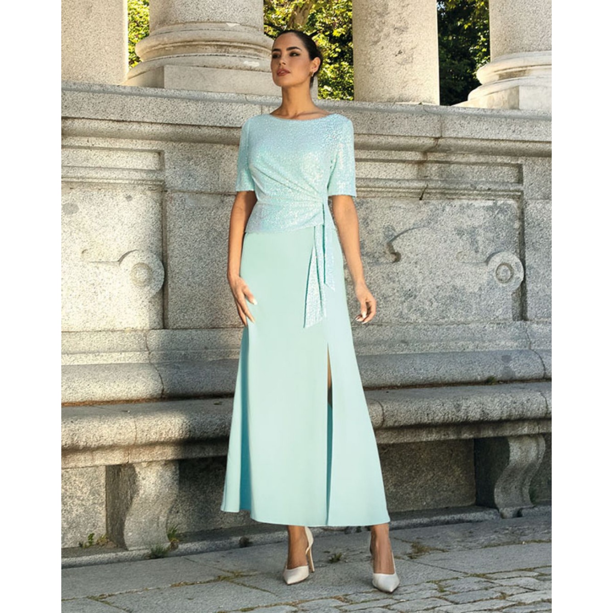 Das phänomenale lange Kleid in einem mintblauen Farbton ist die perfekte Wahl für Hochzeiten, Bälle und besondere Anlässe. Das Modell kombiniert den subtilen Glanz eines Paillettenoberteils mit einem klassischen geraden Maxirock, der in einem auffälligen Schlitz endet, der Leichtigkeit und Sinnlichkeit verleiht.