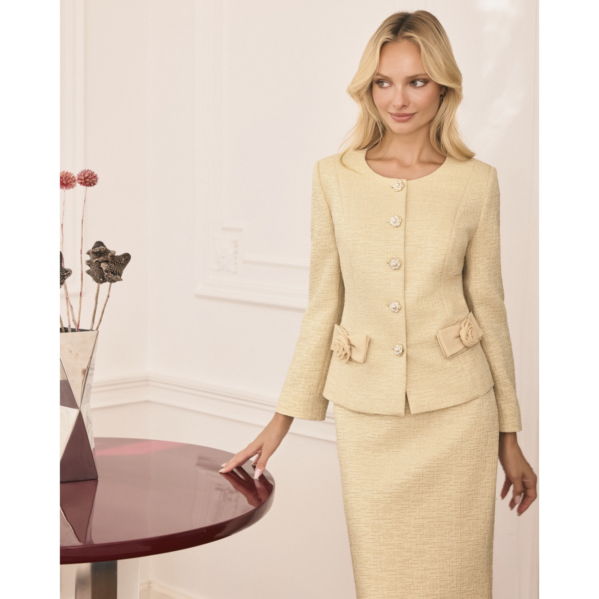 Eleganter Anzug in Goldfarbe, bestehend aus einer taillierten Jacke und einem knielangen Bleistiftrock. Die klassische Jacke, die mit Zierknöpfen geschlossen wird, betont wunderschön die Silhouette, und subtile Details in Form von Zierrosen an den Taschen verleihen dem Ganzen außergewöhnliche Eleganz.