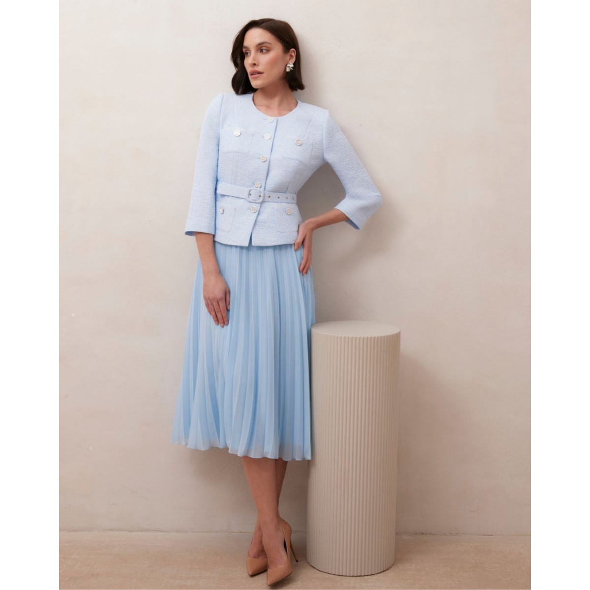 Ein moderner Anzug in einer schönen blauen Farbe. Tailliert geschnittene Jacke aus feinem Jacquard mit einem Gürtel, der die Taille akzentuiert.