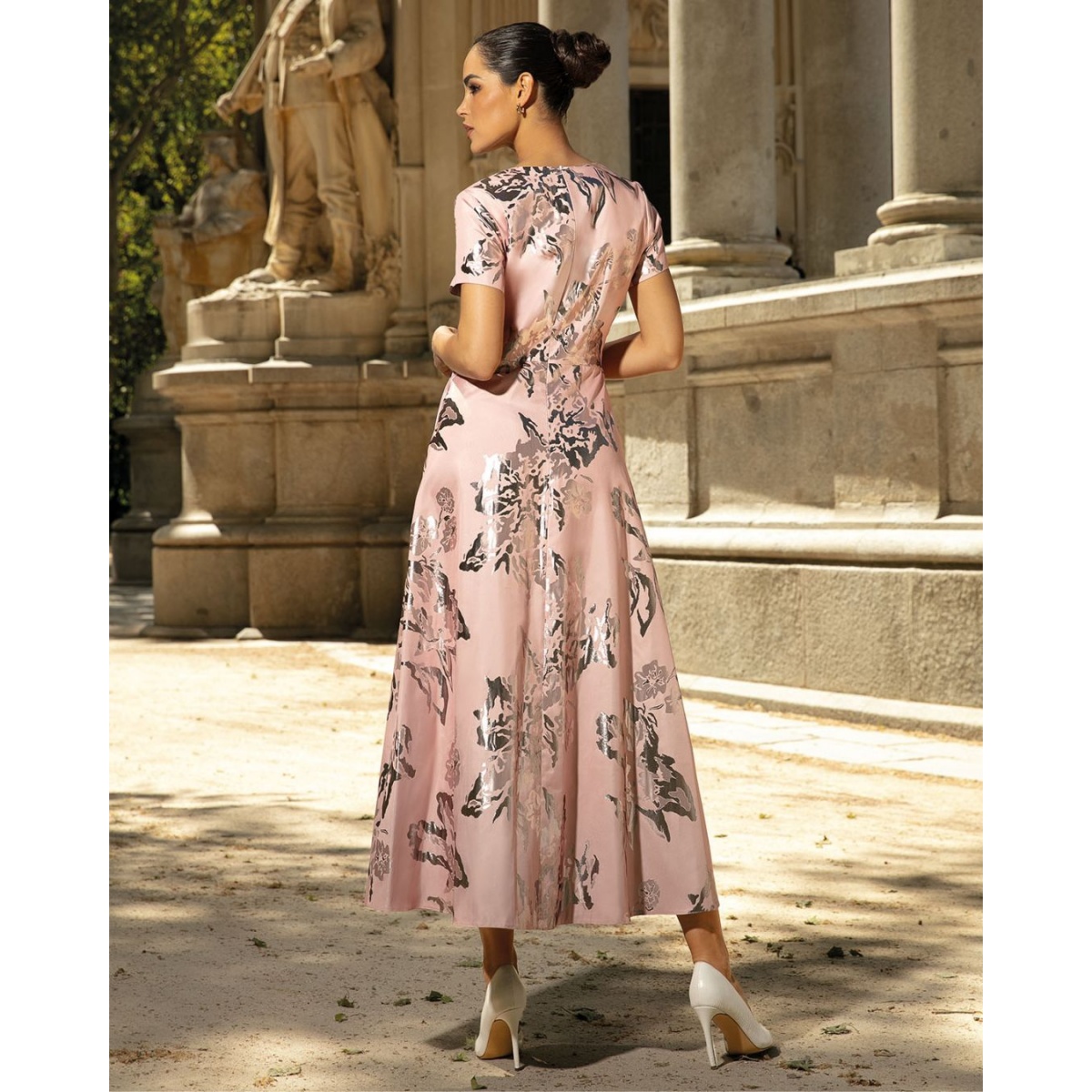Langes Abendkleid in der modischsten Farbe der Saison. Aus angenehm leichtem Taft mit einem glänzenden floralen Muster. Tailliertes Oberteil mit Rundhalsausschnitt und leicht ausgestelltem Unterteil.