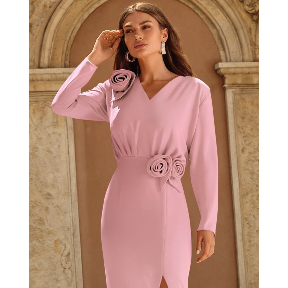 Das Modell Arena ist ein phänomenales langärmeliges Kleid. Dieses Kleid kombiniert geschmackvoll die neuesten Trends mit zeitlos klassischer Eleganz. Die Maxi-Länge unterstreicht den schicken Charakter des Modells und macht es zum perfekten Abendkleid. Die Kreation hat einen schönen Schnitt, der sich perfekt an die Silhouette anschmiegt. Der obere Teil des Kleides ist leicht locker und fällt nicht. Der sinnliche V-förmige Ausschnitt betont die Vorzüge der weiblichen Figur und verschlankt optisch den Hals. Der lange gerade Ärmel verweist auf den klassischen Stil der Kreation. Das Kleid hat Schulterpolster, die den Schnitt noch attraktiver wirken lassen. Das Modell hat einen Ausschnitt an der Taille, wodurch die Taille schön akzentuiert werden kann. Der untere Teil der Kreation hat einen Bleistiftschnitt, der mit einem sinnlichen Beinschlitz verziert ist, der die Bewegung weiter erleichtert. Ein modischer und eleganter dekorativer Akzent in Form von ansteckbaren Verzierungen aus dreidimensionalen Rosen aus Stoff in der Farbe des Kleides verleiht diesem Modell einen einzigartigen Charakter. Das Kleid wird an der Seite mit einem verdeckten Reißverschluss geschlossen. Das Viskosefutter befindet sich über die gesamte Länge der Kreation. Die Farbe des Stoffes ist dezent und elegant. Puderrosa ist auch in dieser Saison äußerst modisch und eignet sich für viele schicke Anlässe.
