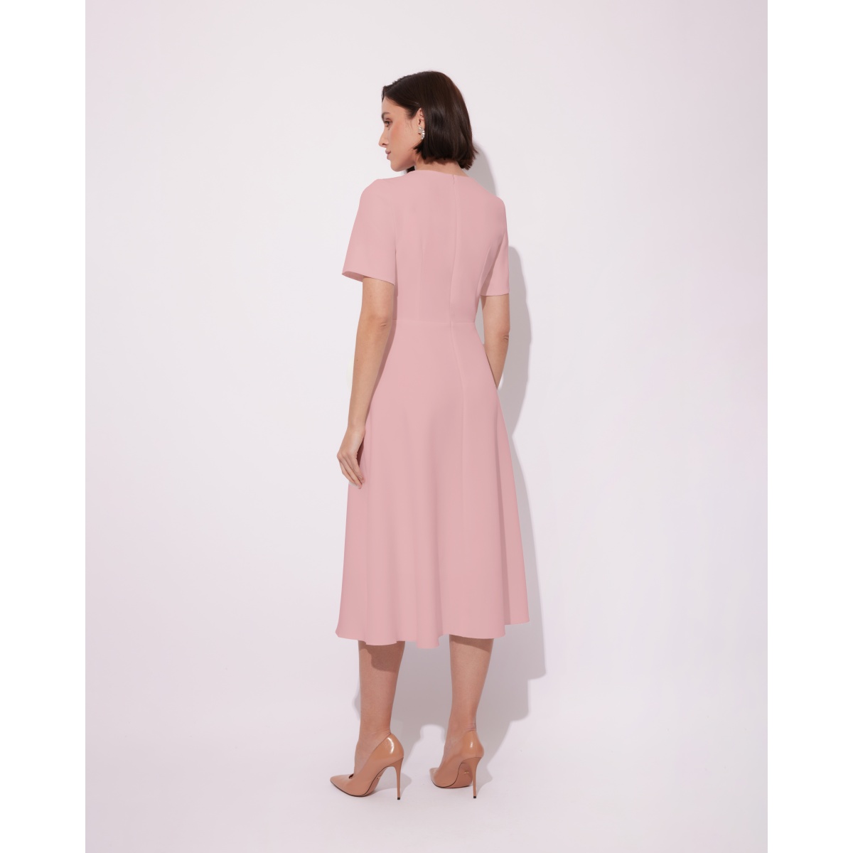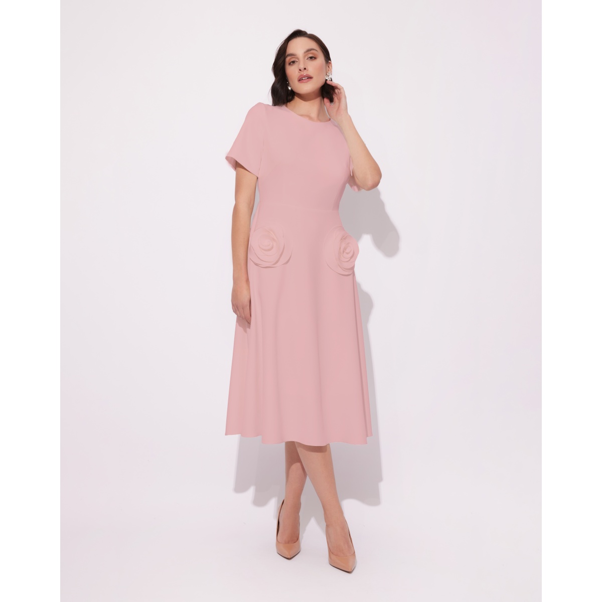 Elegantes Kleid in Hellrosa. Klassisches Midi-Modell mit originellen Zierrosen.