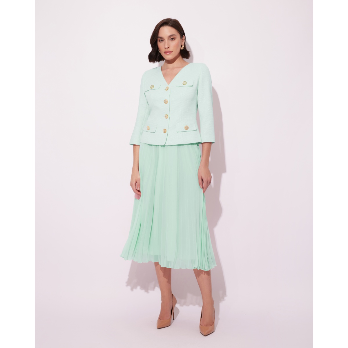 Elegantes zweiteiliges Set bestehend aus einem plissierten Midirock und einer taillierten Jacke. Die Jacke wird mit dekorativen Knöpfen geschlossen.