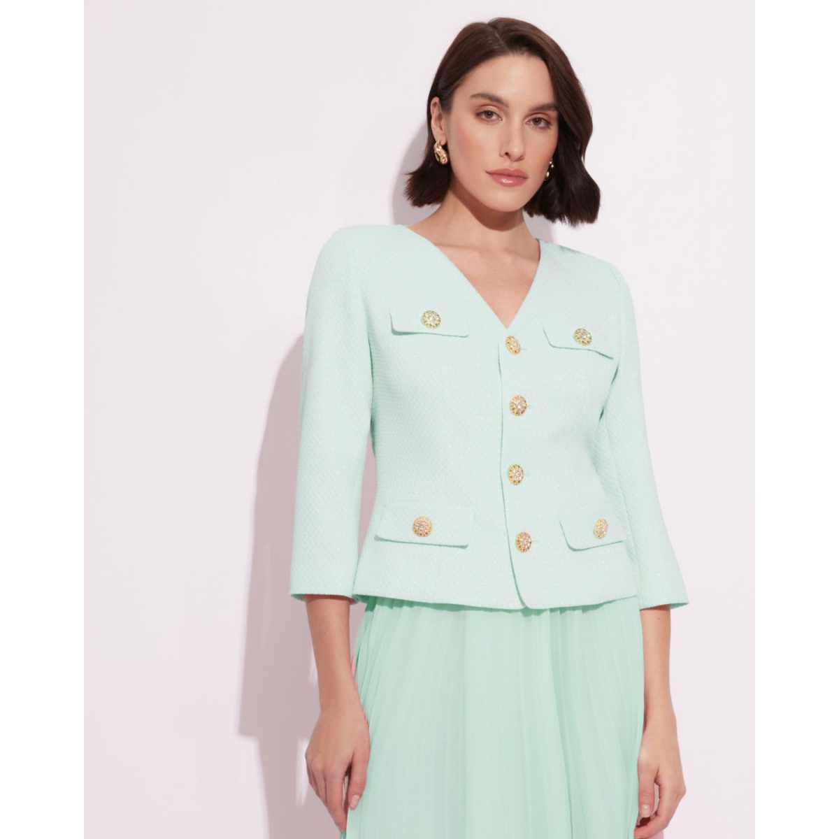 Ein stilvolles Set in einem zarten Mintton ist eine ausgezeichnete Wahl für Frauen, die Eleganz und Raffinesse schätzen. Eine taillierte Jacke mit V-Ausschnitt und 3/4-Ärmeln betont schön die Silhouette und verleiht dem Ganzen einen klassischen Charakter. Das ganze Stück wird mit dekorativen goldenen Knöpfen geschlossen, mit dekorativen Aufnähern, die einen eleganten Schlusspunkt setzen.