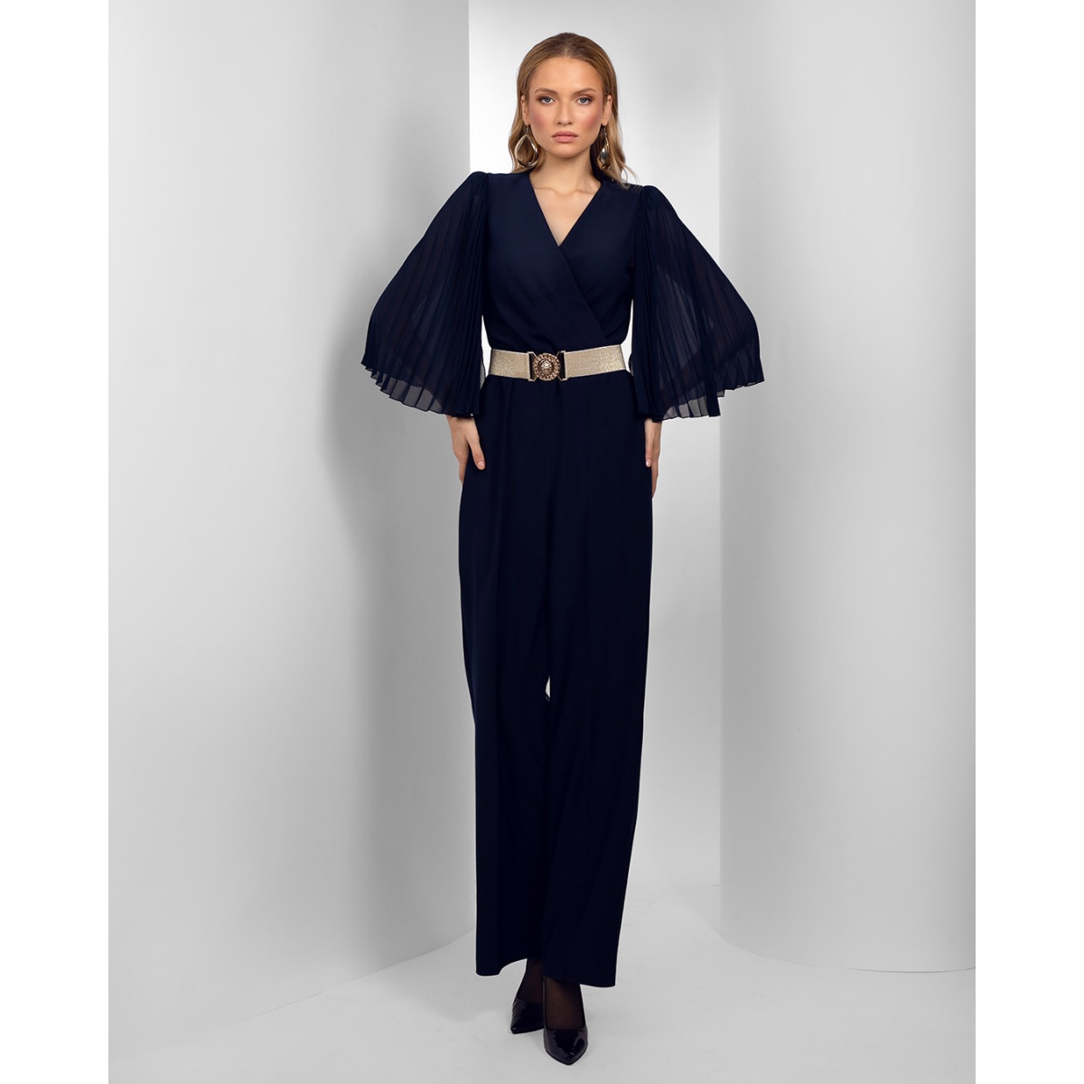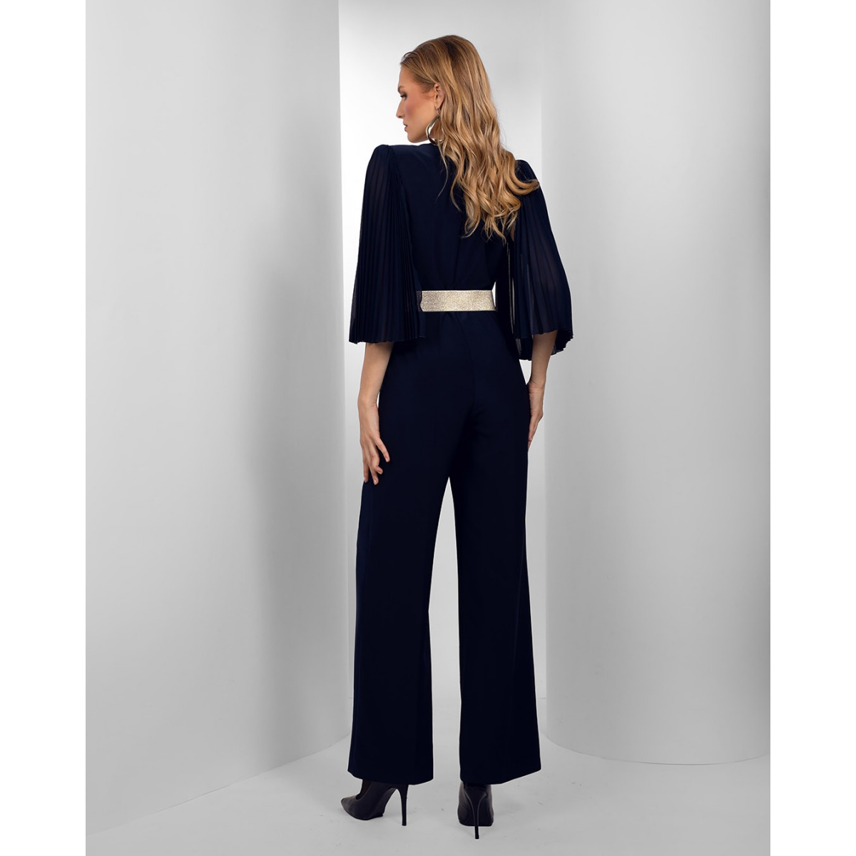 Eleganter dunkelblaues Jumpsuit mit einem einzigartigen Schnitt. Seine originellen Plissee-Ärmel verleihen ihm eine subtile Leichtigkeit und einen raffinierten Touch.