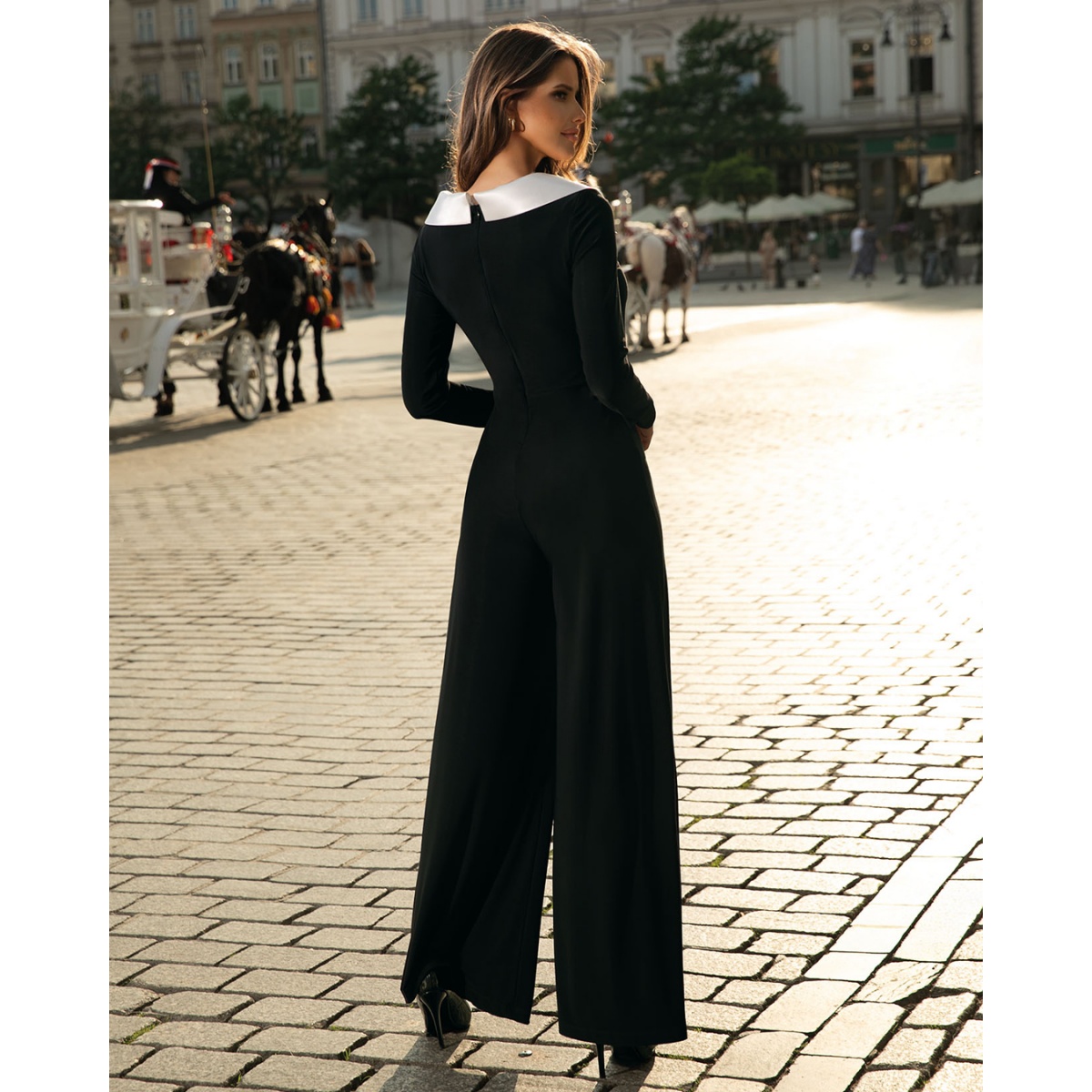 Schwarzer eleganter Jumpsuit aus Stretch-Stoff genäht. Oberteil mit einem breiten, originellen Kragen, der das Dekolleté betont, und einer geraden, weiten Hose.