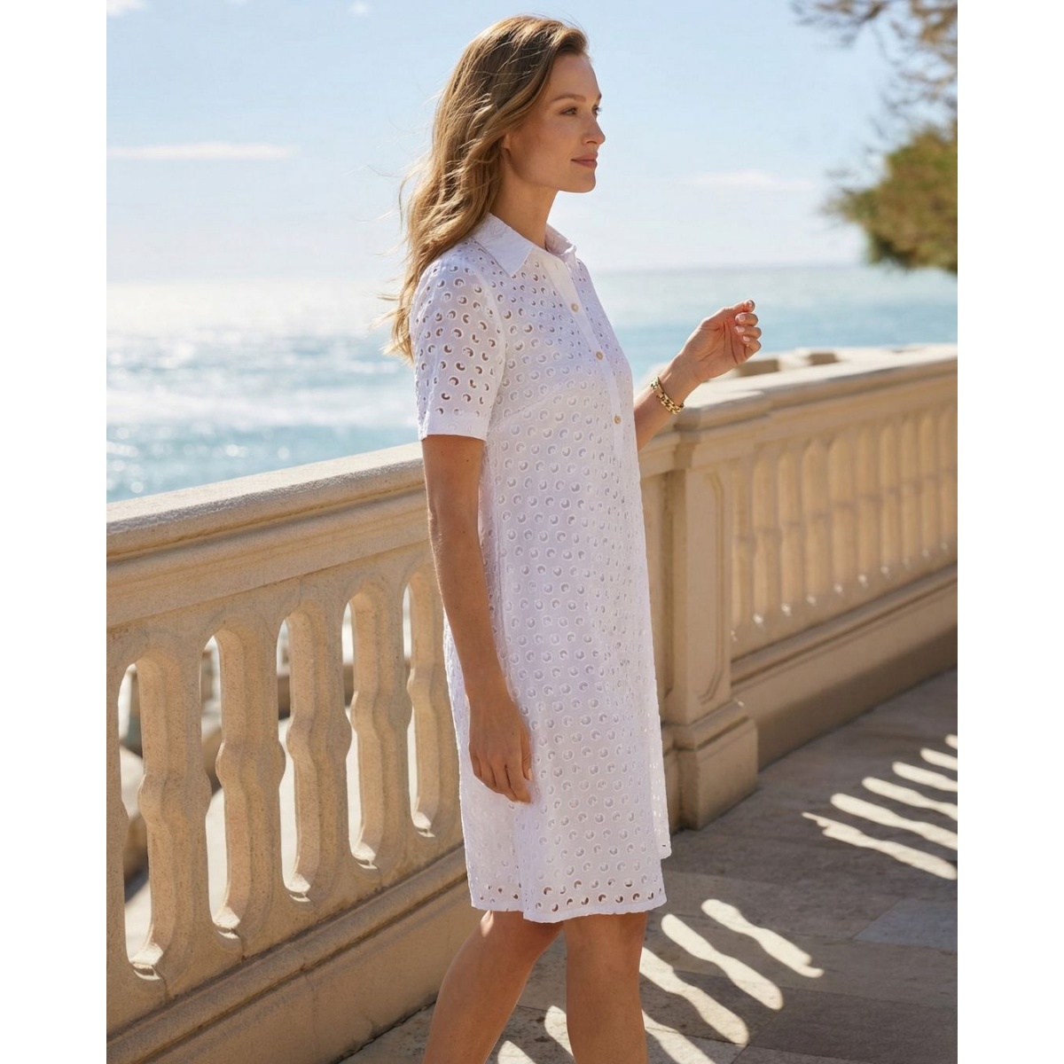 Dieses weiße Sommerkleid aus zartem Richelieu-Stoff ist die perfekte Wahl für sonnige Tage. Der leichte, luftige Stoff garantiert auch bei heißem Wetter Komfort, während die dezente Stickerei einen besonderen Akzent setzt.