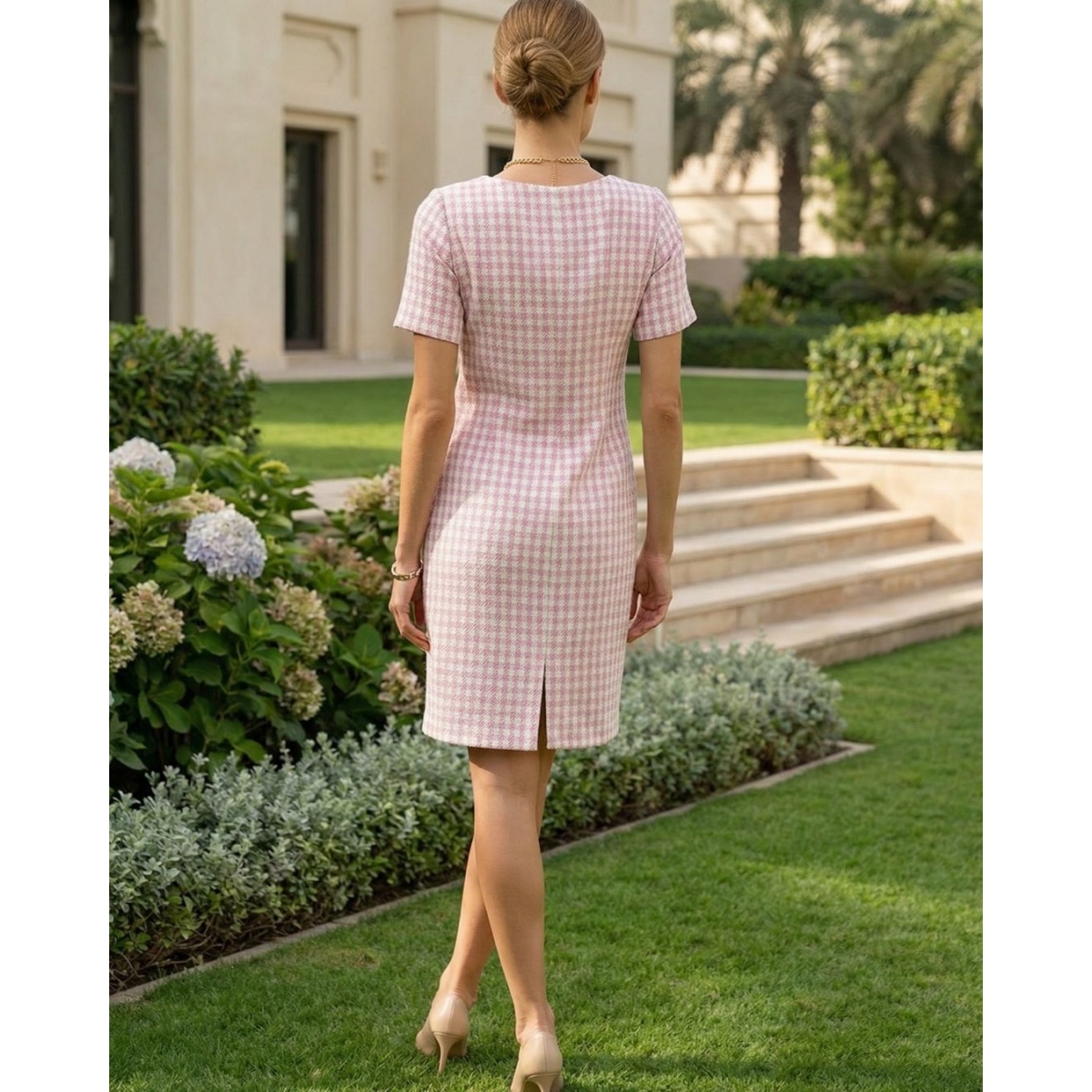 Elegantes Kleid in einem Farbton von Puderrosa aus Chanel-Stoff mit einem dezenten Karomuster. Der einfache, leicht trapezförmige Schnitt sorgt für Komfort und Bewegungsfreiheit.
