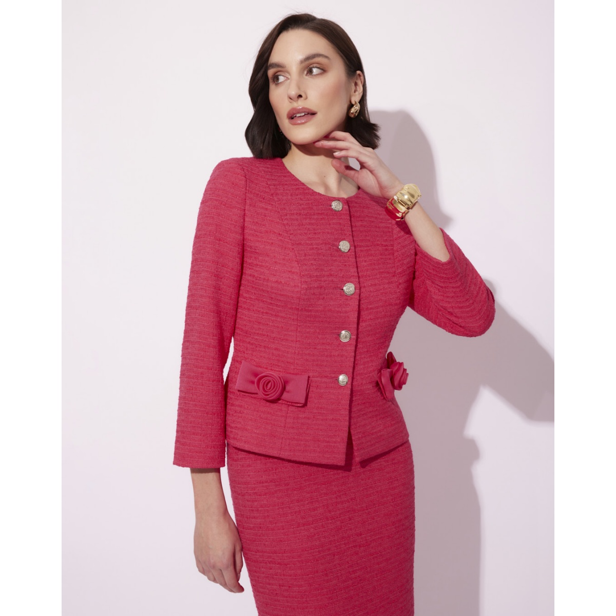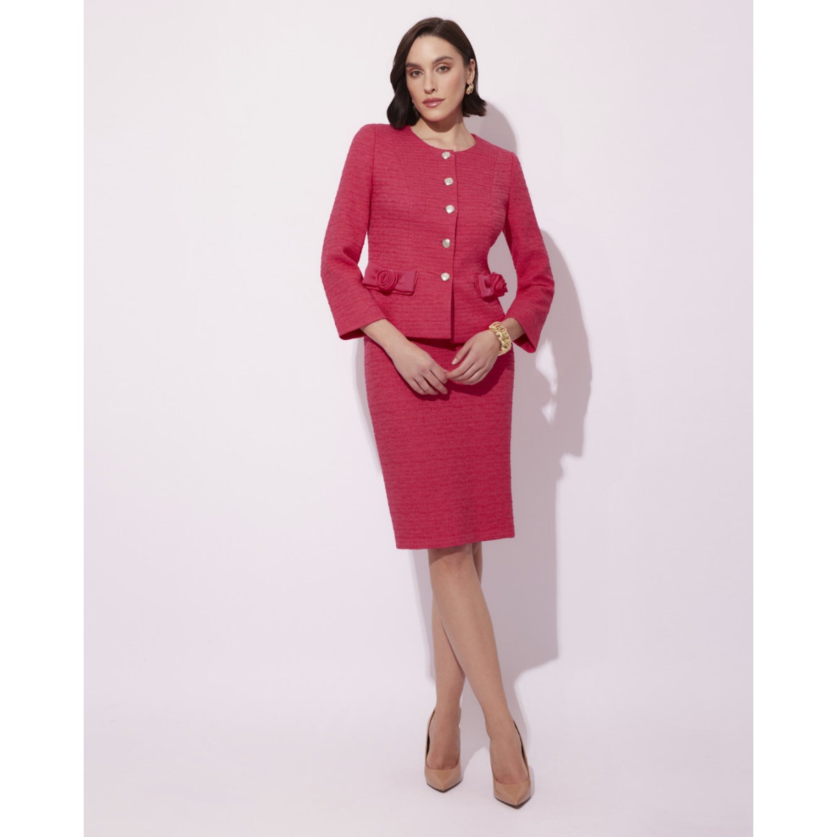 Der elegante Georgia Anzug kombiniert Klassiker mit den modischsten Details der Saison. Die klassische, mit Chiffonrosen und Silberknöpfen verzierte Jacke ist die Essenz der Eleganz.