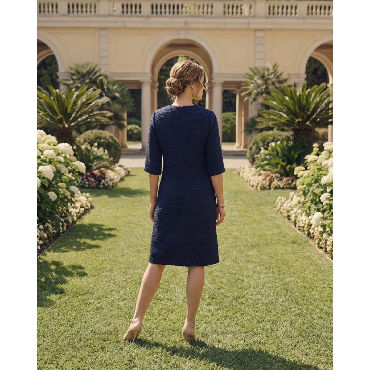 Elegantes Kleid in klassischem Marineblau, gefertigt aus Bouclé-Stoff, der sich durch eine subtile, strukturelle Textur auszeichnet. Der einfache, leicht taillierte Schnitt garantiert Tragekomfort und zeitlose Eleganz.