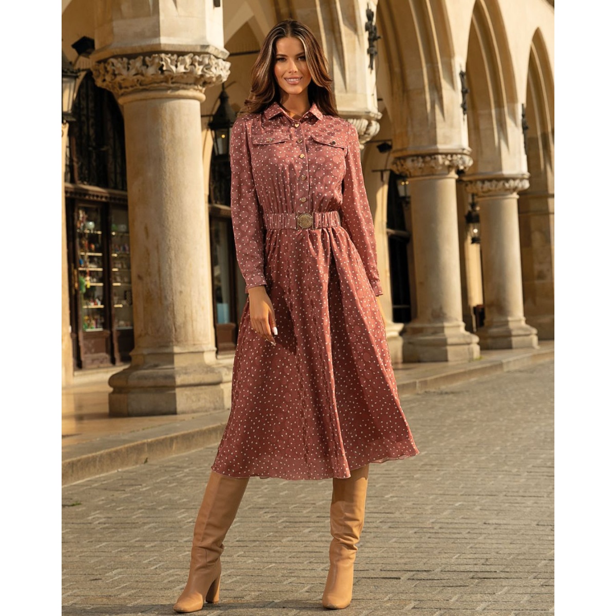 Ein Ausschnitt in der Taille und ein elastisches Band betonen die Silhouette und sorgen für einen angenehmen Tragekomfort. Das Kleid wird mit einem eleganten elastischen Gürtel geliefert, der mit Stoff in der Farbe des Kleides eingefasst ist und mit einer goldenen Schnalle abgeschlossen wird - der gesamte Look ist feminin und sehr stilvoll.