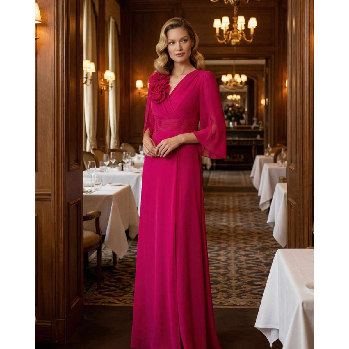 Abendliches Maxikleid in einer intensiven Amarantfarbe, in einem eleganten Schnitt mit V-Ausschnitt. Verziert mit auffälligen Blumenapplikationen an der Schulter und zarten Schlitzen an den Ärmeln.
