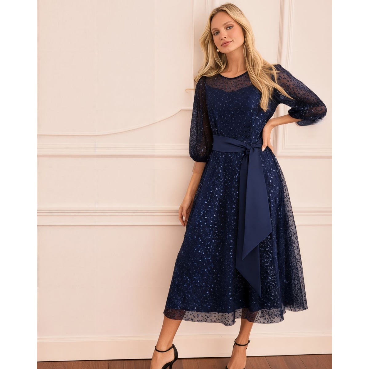 Ein marineblaues, midilanges Kleid aus Chiffon, das mit zarten Pailletten bestickt ist. Darunter befindet sich ein bequemes elastisches Futter in Marineblau. Feminines Modell mit Taille, die durch eine elegante Taftschärpe akzentuiert wird.