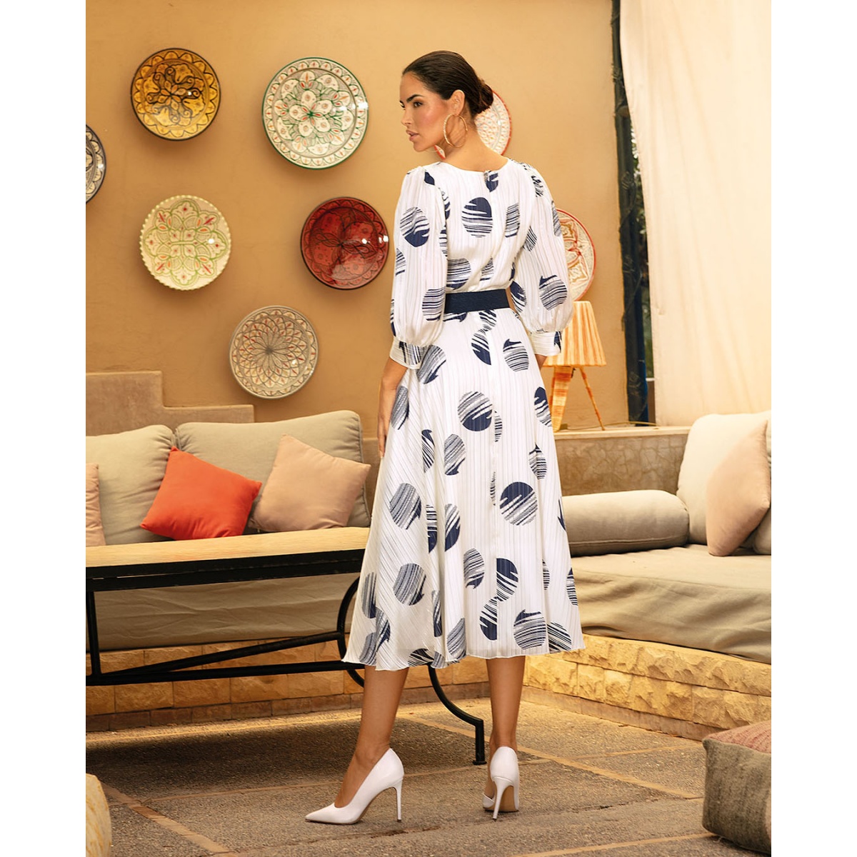 Airy midi length dress, sewn from airy fabric in navy blue circles. Waist emphasized with an elastic belt.