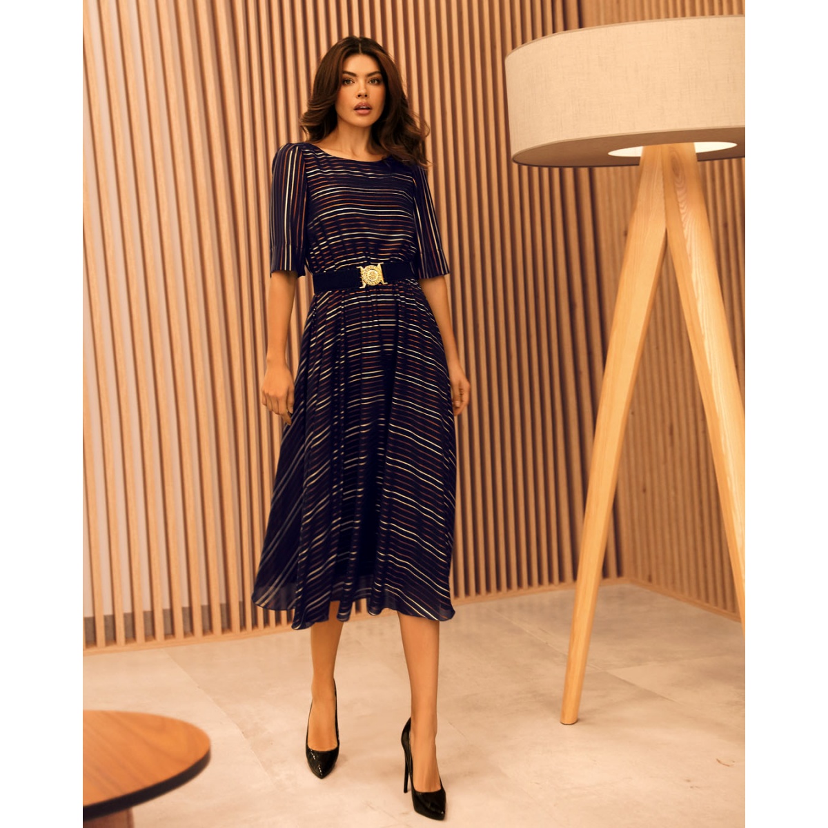 Elegant midi dress with a waist accentuated by an elegant belt. Feminine midi length emphasizes the legs. Striking navy blue fabric with metallic gold-copper stripes.