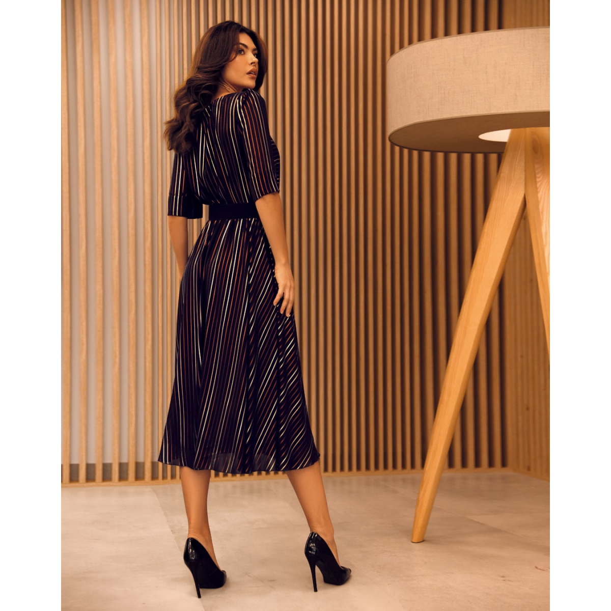 Viktoria is an elegant midi length dress with belt. Attention is drawn to the attractive chiffon fabric in navy blue with metallic gold and copper stripes. The fabric is slightly transparent. A flared cut with an emphasized waist accentuates the advantages of the silhouette and masks its possible imperfections. The midi length is extremely chic and suitable for most occasions. The creation has a sewn-in elastic waistband and attached an elegant decorative belt with a gold-colored buckle. The boat neckline is another striking accent in the creation. The fabric with a predominance of viscose fits perfectly on the body and lies beautifully. The creation looks fantastic in motion, which can be seen in the attached video. The sleeves of the dress are elbow-length. The dress on its length has a viscose lining, which affects not only the beautiful appearance, but also increases the comfort of the creation. The dress does not have a zipper.