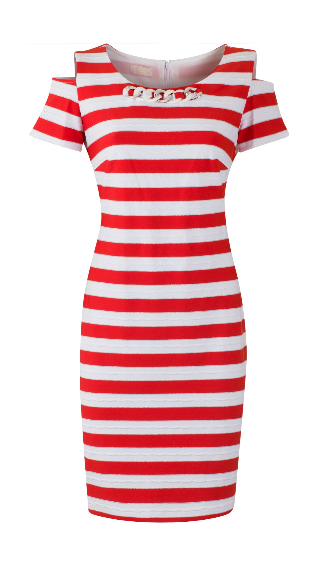 also slightly uncovered shoulders and jewelry embellishment at the neckline.