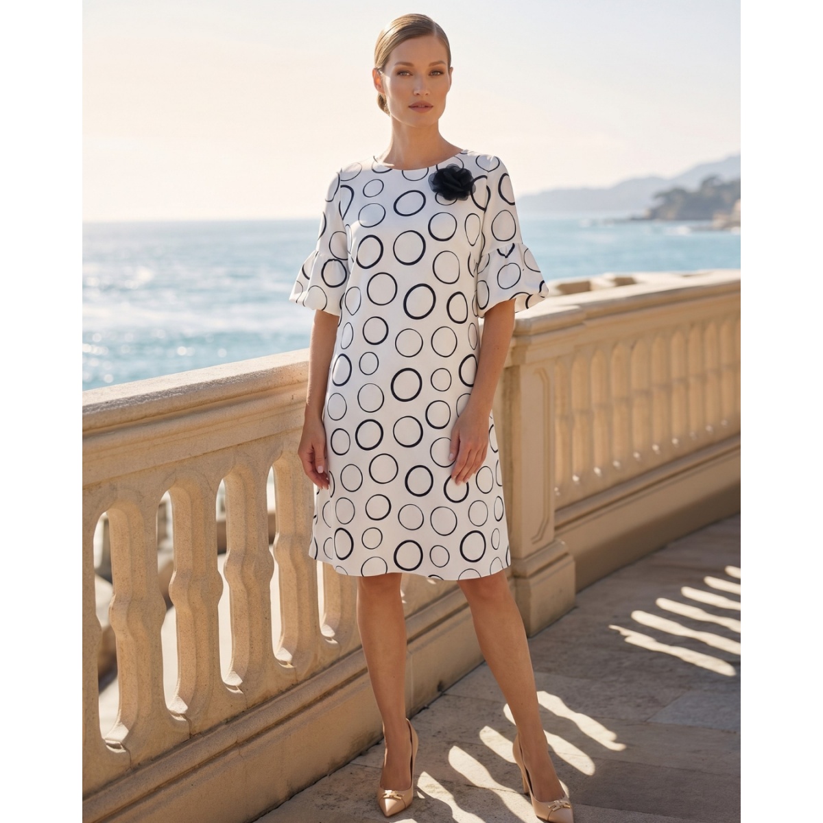 An elegant dress in a black and white pattern is a proposal for women who appreciate classic in a modern edition. The stylish print in geometric circles gives the whole a unique character.