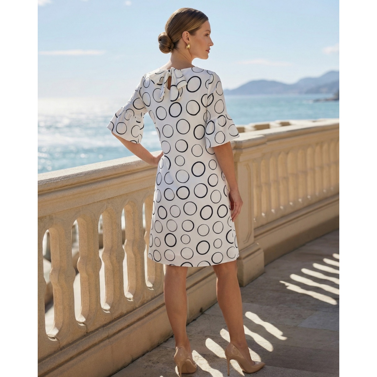 An elegant dress in a white-navy pattern is a proposal for women who appreciate classic in a modern edition. The stylish print in geometric circles gives the whole a unique character, and the timeless color scheme makes the model perfect for many occasions.