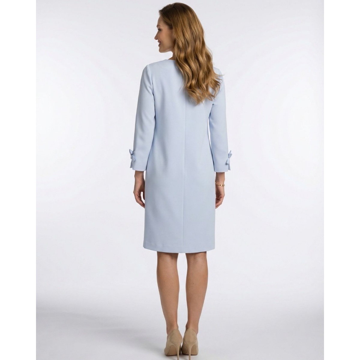 Elegant dress with a simple, slightly trapezoidal cut, which provides comfort and freedom of wear. The model is distinguished by subtle bows at the neckline and on the sleeves, adding a feminine and delicate character to the whole.