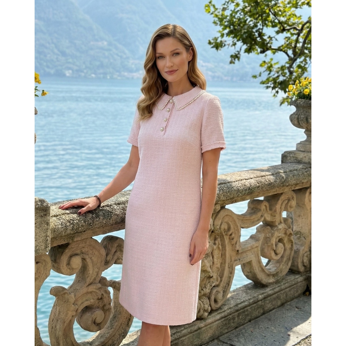 The model stands out with a elegant, classic collar trimmed with delicate pearls, which beautifully exposes the neck and adds a unique subtlety to the styling. The front is adorned with decorative buttons with a pearl finish, an elegant detail that attracts attention and emphasizes the luxurious character of the dress.
