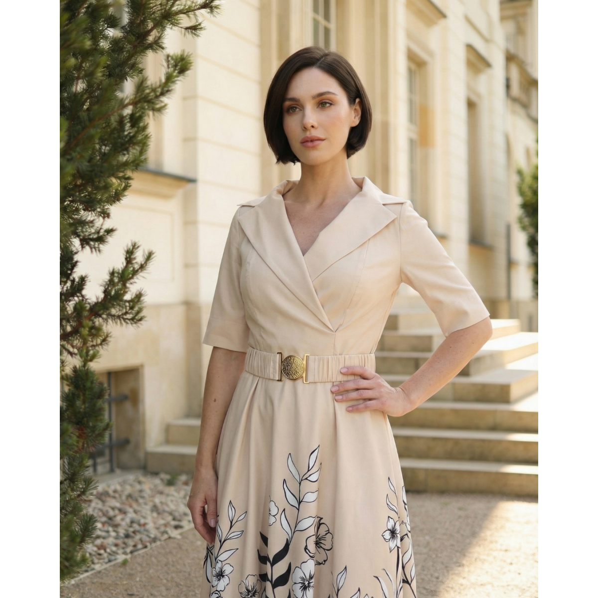 Evening dress in a beautiful beige color with a floral black pattern. Feminine blousy model with a cut-off at the waist and a waist accentuated with an elegant belt.