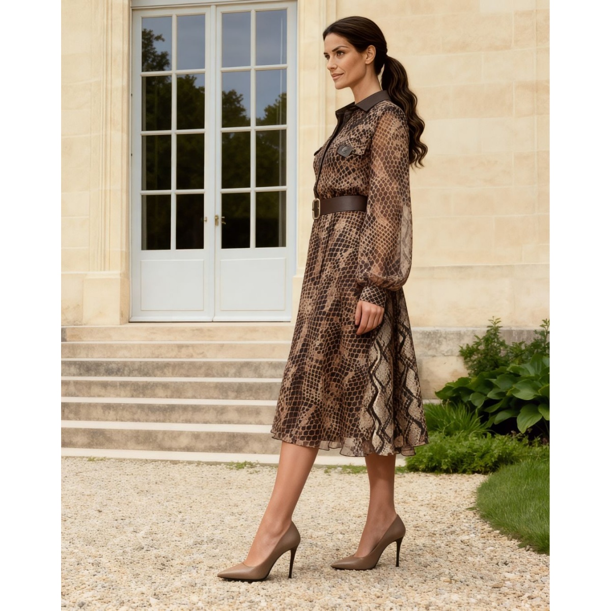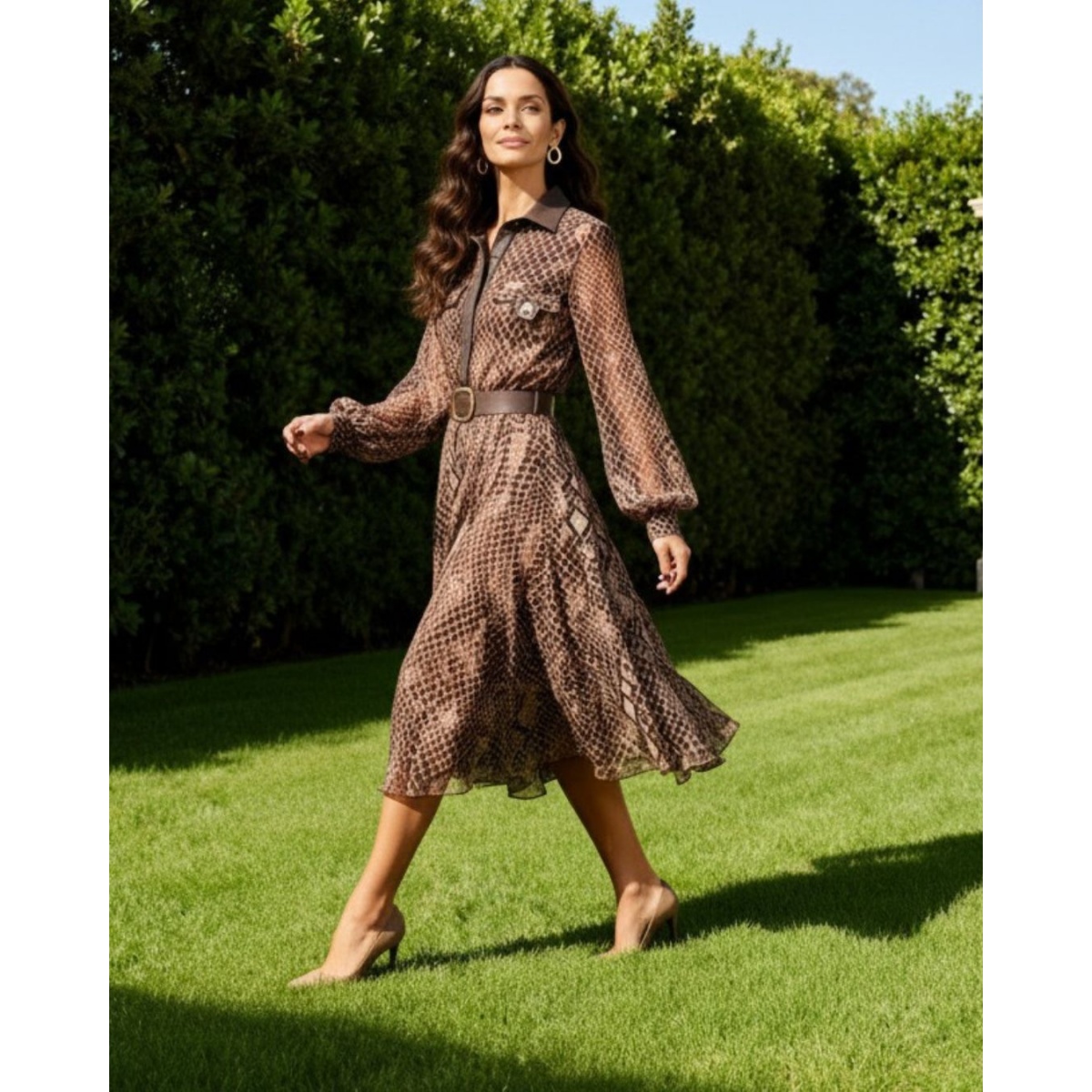 An ethereal dress sewn from chiffon fabric in an animal pattern. Feminine midi length with a waist accentuated by an elegant brown belt with a gold buckle. collar and clasp, along with buttons, finished with artificial leather.