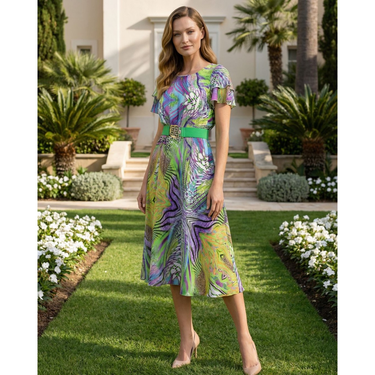 The dress is sewn from refined viscose with polyamide. This makes the material very comfortable and ideal for a summer dress. A unique asset of this midi cocktail dress is the unique print in beautiful summer colors. The dress has a fitted top and a flared bottom. The waist is additionally marked with a decorative belt made of green rubber with a gold ornamental buckle. Round neckline at the neck. Short, fine sleeves, consisting of two gently wavy layers. The dress does not have a pillowcase, which makes it ideal for hot days both for parties and for work.