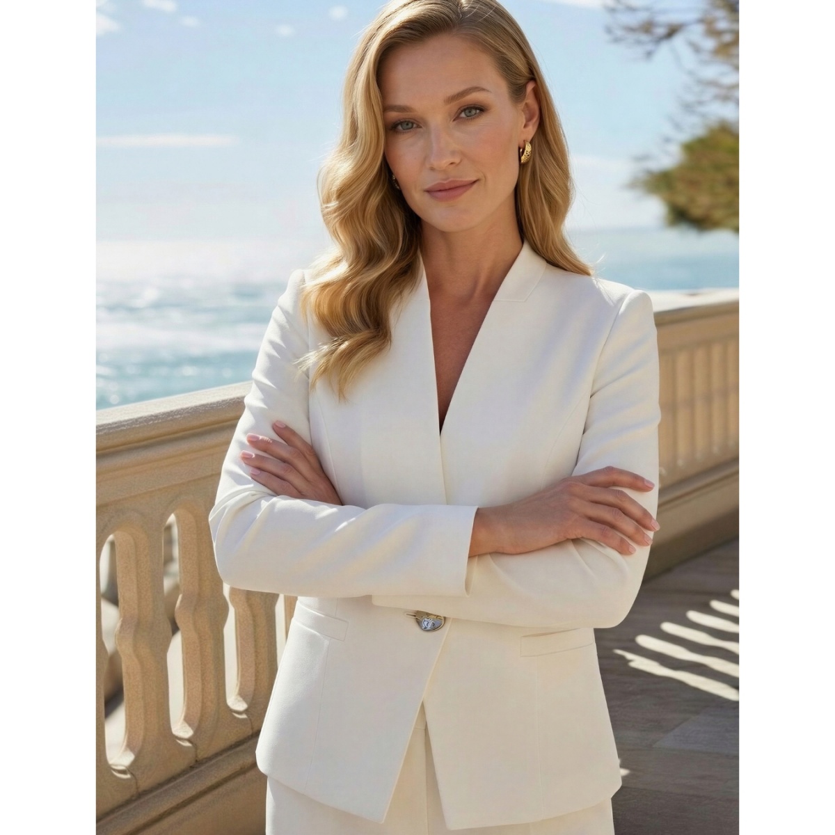 The cut subtly emphasizes the silhouette, giving it lightness and proportion. The deep, feminine V-neckline slims the neck line, and a single, gold button is an elegant accent that attracts attention. The simple form of the jacket has been complemented by subtly marked pockets, which emphasize its classic character.