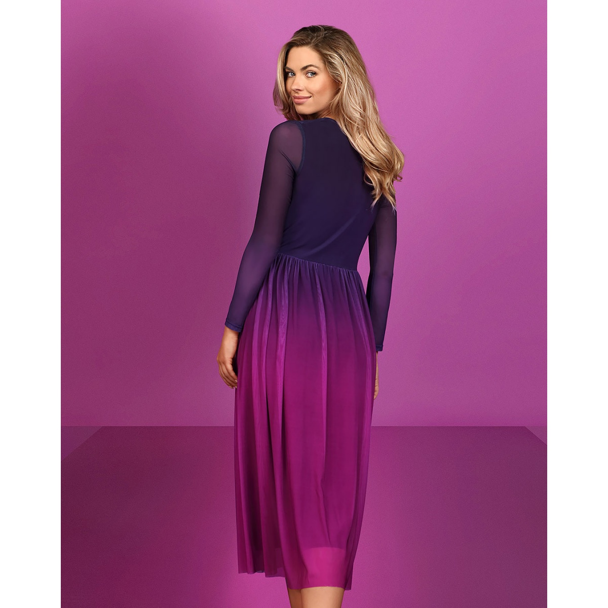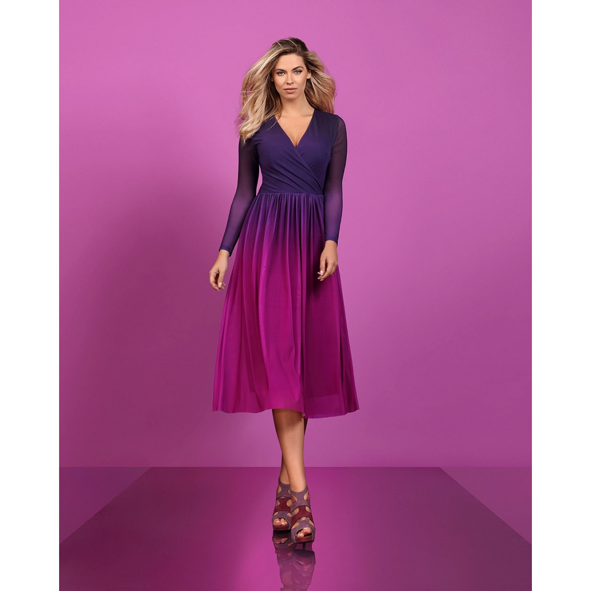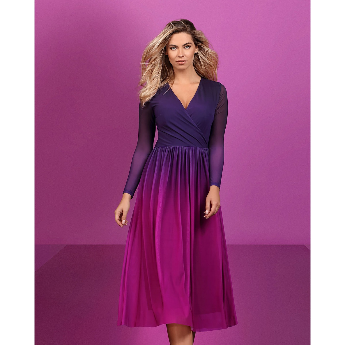 Shaded dress sewn from semi-transparent, high-quality mesh in purple. The dress is cut off at the waist, which can be further accentuated with a black belt sewn from fabric, which can be beautifully tied. V-shaped envelope neckline.