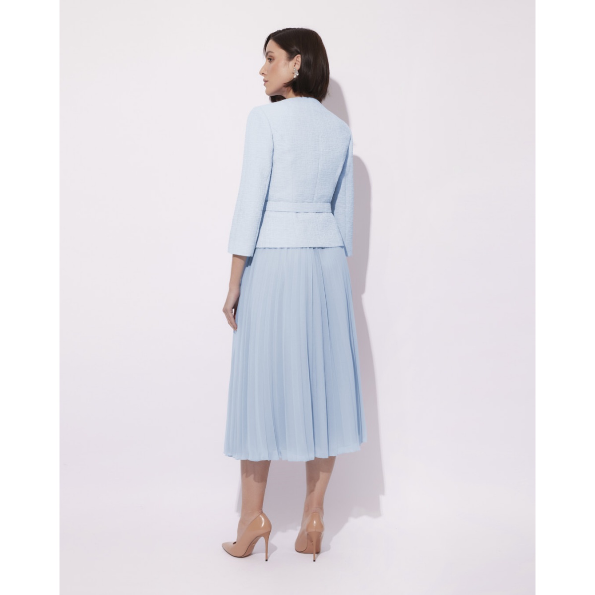 This elegant suit with pleated skirt is the perfect choice for a wedding, communion or other family celebrations. The combination of a classic jacket with a light, airy skirt makes the styling exceptionally feminine and elegant, yet extremely comfortable.