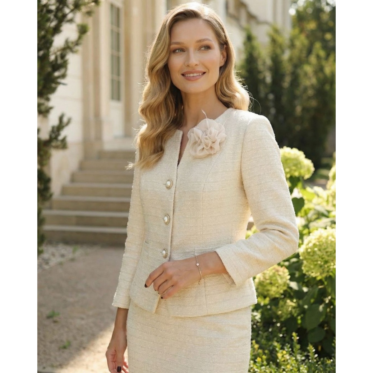 An elegant women's suit in a beige shade, consisting of a fitted jacket and a classic knee-length pencil skirt. Made of high-quality fabric with a structural texture, which gives the whole a noble and timeless character.