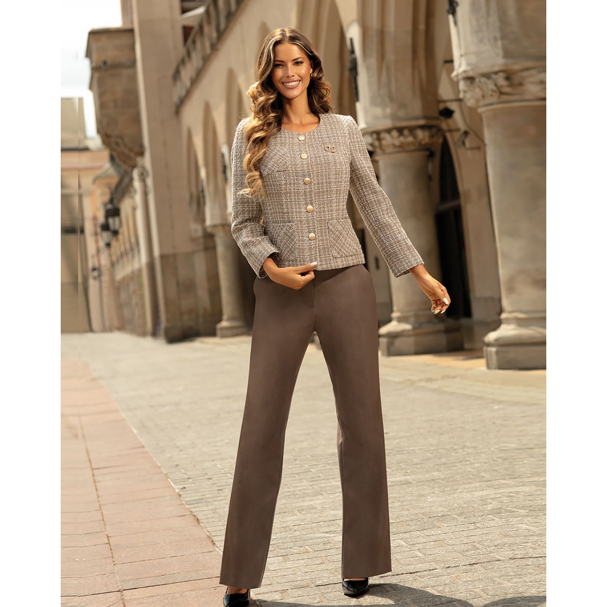 Elegancki komplet damski Taylor to połączenie dopasowanego żakietu uszytego z materiału typu "channel" oraz prostych spodni z tkaniny garniturowej. Całość utrzymana w odcieniach beżu i brązu. Materiał żakietu ma złotą nitkę.