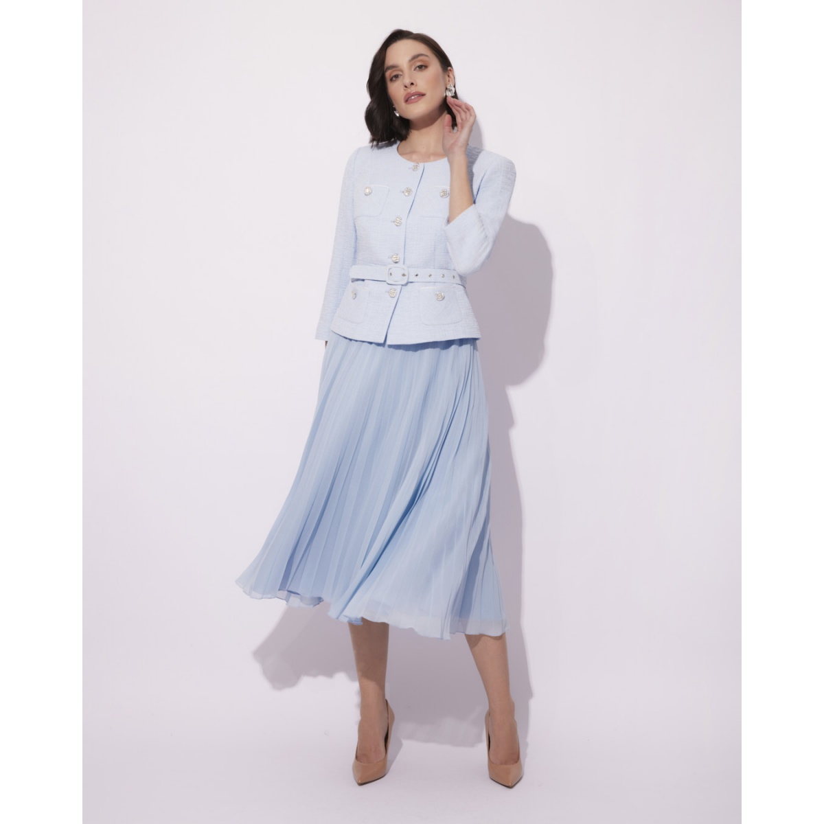 Ta elegancka garsonka z plisowaną spódnicąto doskonały wybór na wesele, komunię lub inne uroczystości rodzinne. Połączenie klasycznego żakietu z lekką, zwiewną spódnicą sprawia, że stylizacja jest wyjątkowo kobieca i elegancka, a jednocześnie niezwykle wygodna.