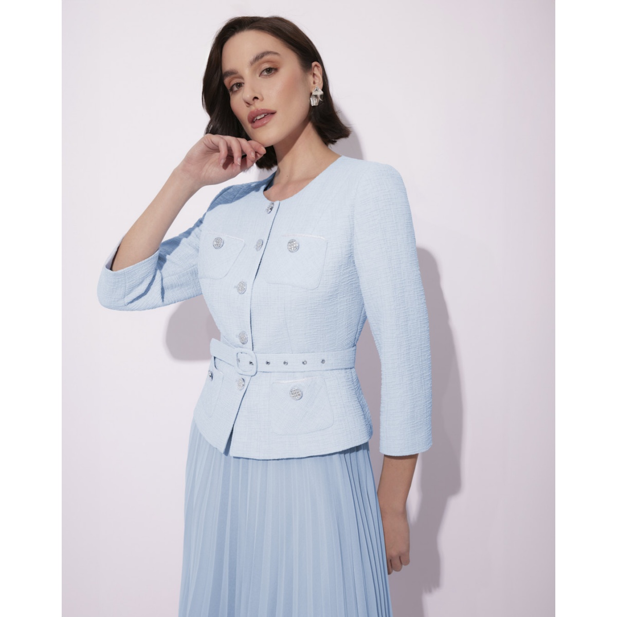 Dopasowany żakiet zapinany na srebrne guziki z cyrkoniami, które subtelnie połyskują, dodając kreacji ekskluzywnego wyglądu. Okrągły dekolt podkreśla klasyczny charakter modelu, a ozdobne kieszonki wykończone lamówką i guziczkiem dodają mu eleganckiego detalu. Talia została dodatkowo zaakcentowana paskiem, który pięknie modeluje sylwetkę.