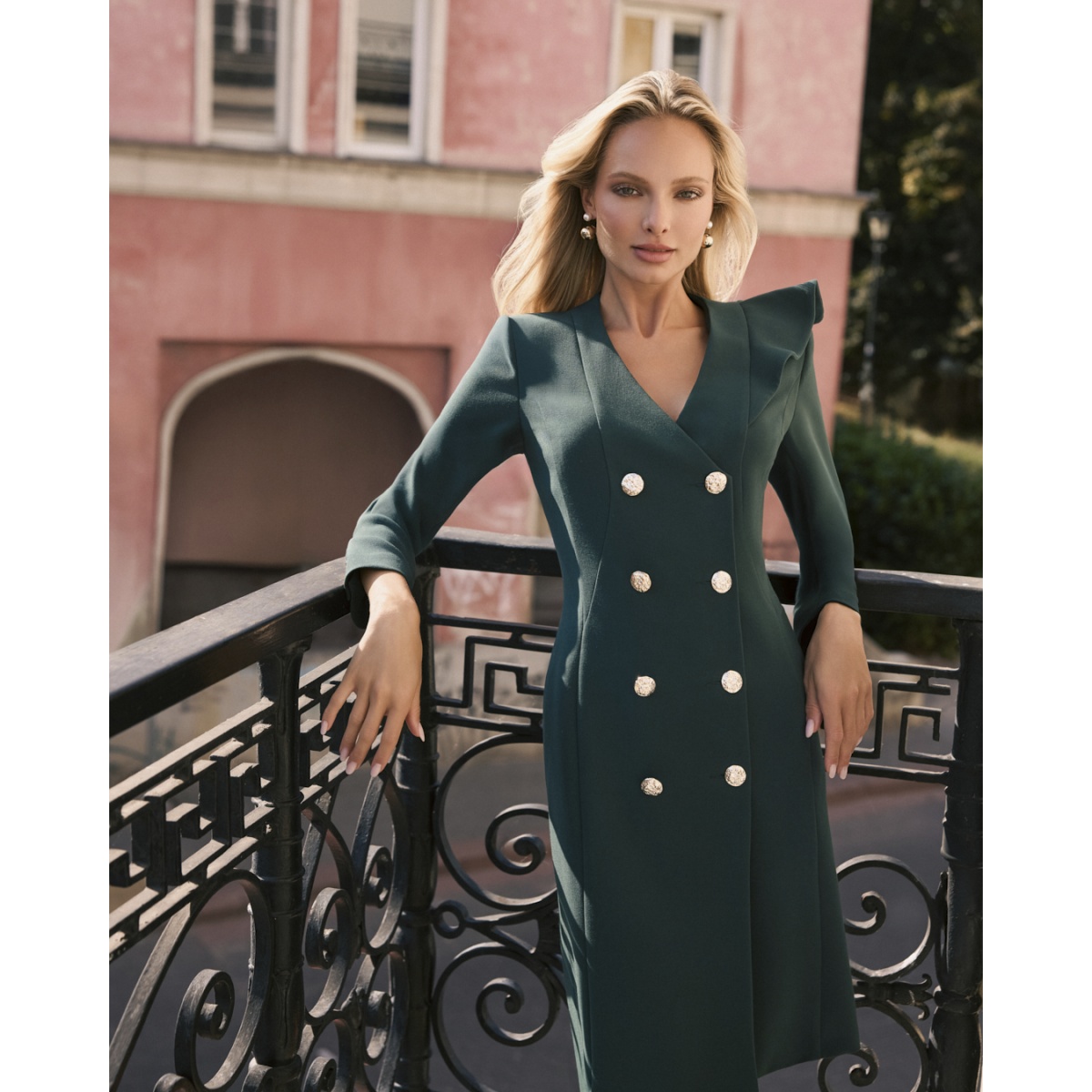 Elegancka sukienka o kroju marynarki w głębokim, butelkowozielonym kolorze. Dwurzędowe zapięcie z ozdobnymi guzikami podkreśla talię, a ozdoba na ramieniu dodaje sylwetce pewności i klasy.