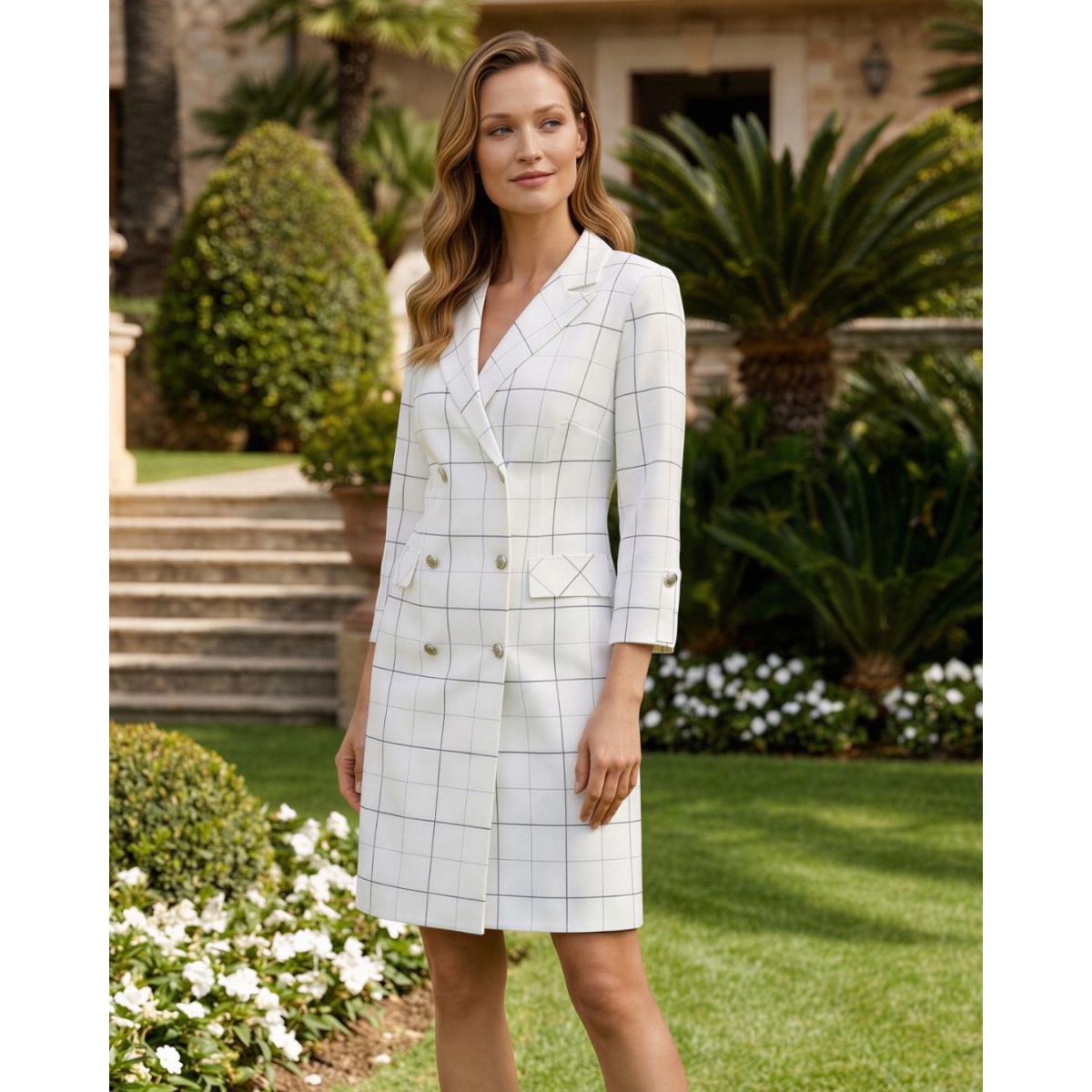 Panama to elegancka sukienka marynarkowa, która stworzona została specjalnie dla Pań, które cenią sobie wyjątkowy styl. To kreacja niezwykle uniwersalna. Efektowny krój nawiązujący do dwurzędowej marynarki z klapami sprawia, że sukienka Panama sprawdzi się zarówno jako kreacja wizytowa, jak i strój w sytuacjach biznesowych. Piękny odcień złamanej bieli i klasyczna delikatna czarna krata to ponadczasowe połączenie, które jest doskonałą bazą do stylizacji. Sukienka ma długość do kolan i jest zapinana na guziki z przodu. Dekolt w V okala klasyczny kołnierz z klapami. Kreację zdobią prostokątne patki. Rękawy mają długość ⅞ i prosty fason. Guziki dekorują również rękawy i pasek z tyłu. Sukienka zaopatrzona jest w podszewkę z wiskozy. Sukienka marynarkowa jest odpowiednia dla różnych typów sylwetek.