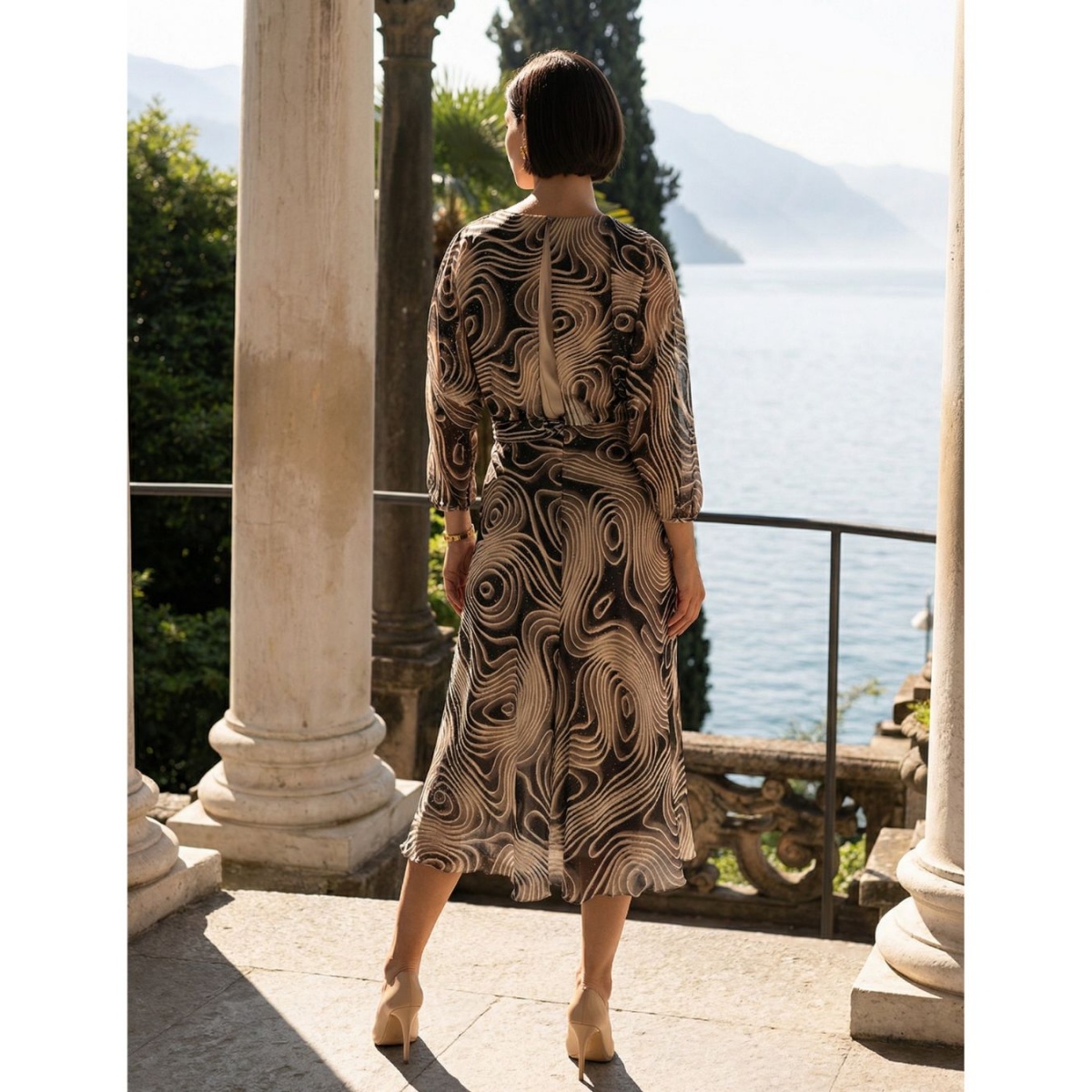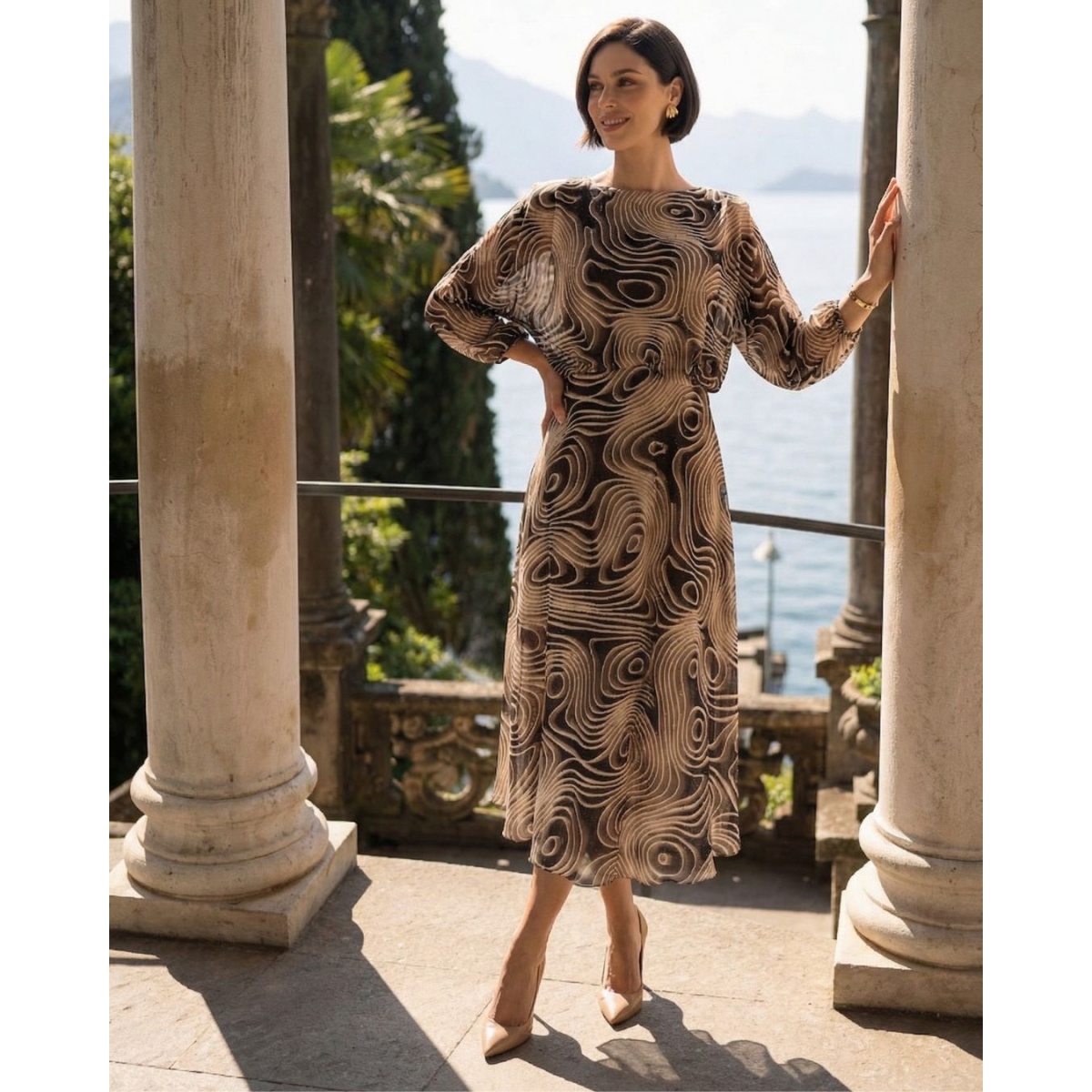 Oryginalny fason i atrakcyjny nowoczesny graficzny wzór sprawiają, że ta sukienka midi z długim rękawem przyciąga spojrzenia. Stonowana kolorystyka kreacji utrzymana w odcieniach beżu i szarości sprawia, że to uniwersalna propozycja na eleganckie okazje. Kreacja uszyta jest z delikatnego szyfonu, który dodaje sylwetce lekkości. Efekt ten wzmacniają długie rękawy typu “nietoperz” oraz stylowa długość midi. Zwiewna tkanina pięknie układa się na sylwetce. Ten fason sprawdza się świetnie na różnych typach figury. W pasie umiejscowiona jest gumka, dzięki której kreacja dopasowuje się do ciała. Od tali sukienka swobodnie opływa ciało delikatnie rozszerzając się ku dołowi. Niebanalnie prezentuje się zbluzowana góra z efektownymi rękawami. Jej swobodna forma pozwala zatuszować ewentualne mankamenty figury. Rękawy są długie i wykończone troczkami przy mankietach. Interesującym akcentem jest rozcięcie na plecach, które dodaje sukience jeszcze bardziej oryginalnego charakteru. Okrągły dekolt podkreśla elegancki styl tej kreacji. Przyjemna podszewka z wiskozy ma zastosowanie zarówno praktycznie, jak i estetyczne. Wpływa na atrakcyjną prezencję kreacji, ale także jej wysoki komfort użytkowania i trwałość. Ponadto właśnie w podszewce znajduje się kryty zamek, dzięki czemu zapięcie jest praktycznie niewidoczne na zewnątrz.